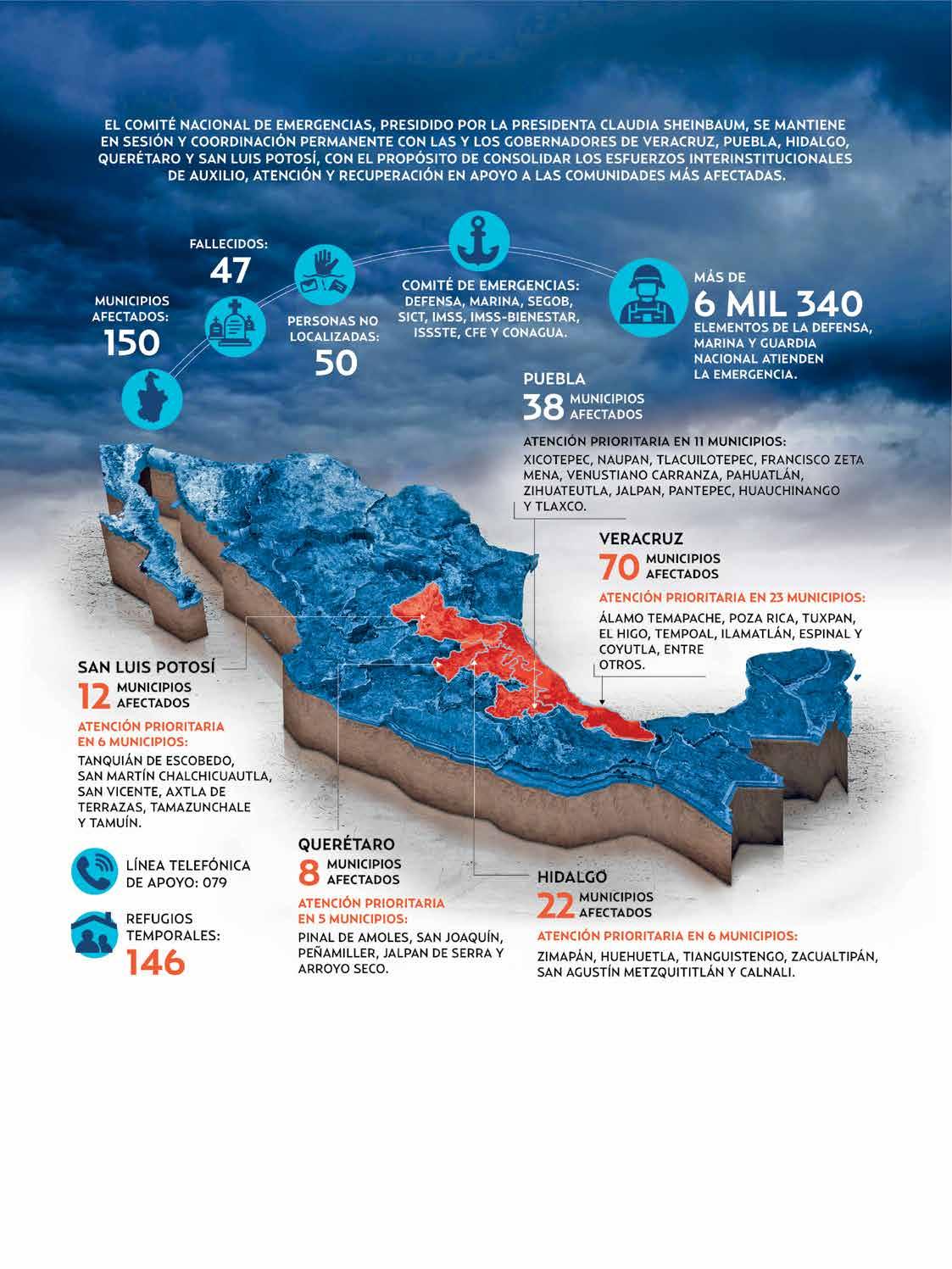 La presidenta Claudia Sheinbaum Pardo recorrió este domingo los estados de Puebla y Veracruz para supervisar la atención a los afectados por las lluvias, además de que instruyó para que hoy inicien los censos para distribuir apoyos, así como las labores de limpieza. “Los vamos a atender a todos”, enfatizó Hasta este domingo, sumaban 47 las personas fallecidas. Será este lunes cuando la titular del Ejecutivo Federal recorra Hidalgo y Querétaro.