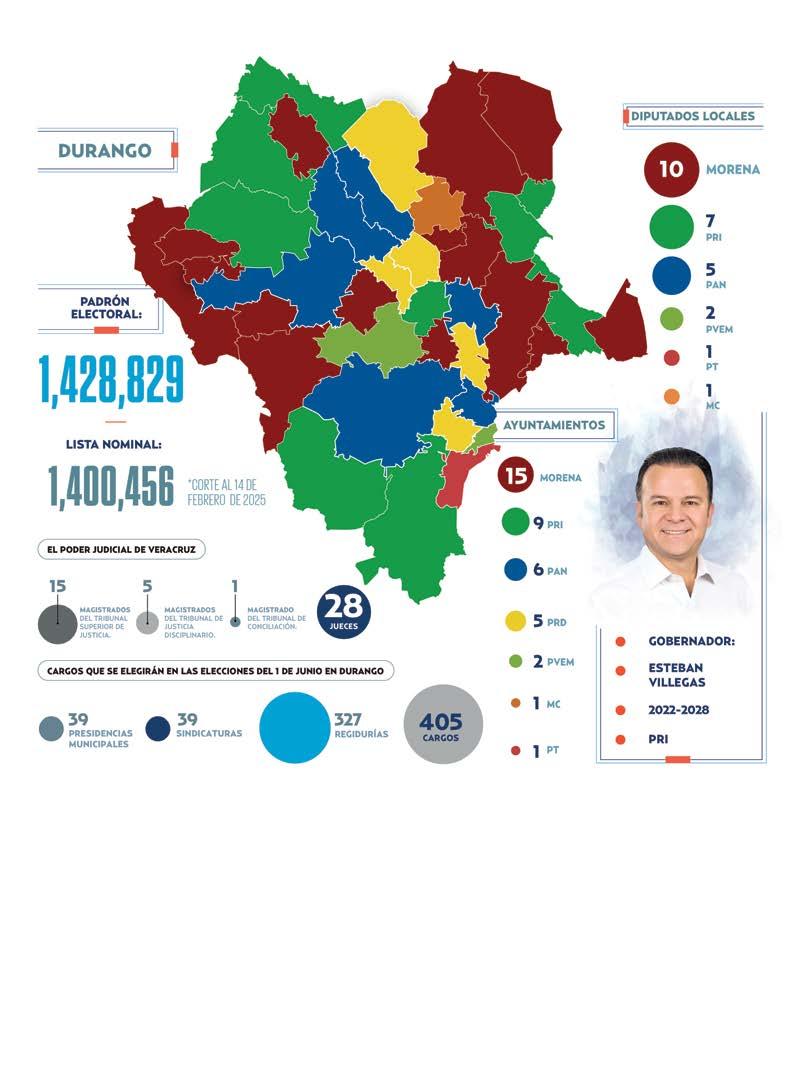 El próximo 1 de junio, los duranguenses podrán renovar 39 presidencias municipales, 39 sindicaturas y 326 regidurías, pero también, a la par, agregó, han organizado la renovación del Poder Judicial local con 49 cargos (21 magistrados y 28 jueces)