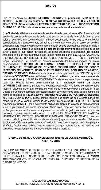 responsable: Alfredo González Castro. Número de Certificado de Reserva otorgado por el Instituto Nacional del Derecho de Autor 04-2009-060419022100-101. Número de Certificado de Licitud de título y Contenido No.16921. Domicilio de la Publicación: Paseo de la Reforma No. 250, Piso 24, Colonia Juárez, Del. Cuauhtémoc, C.P. 06600, Ciudad de México. Imprenta: Impreso en Talleres de La Crónica Diaria , S.A. de C. V. Calzada Azcapotzalco La Villa No. 160 Barrio San Marcos , Alcaldia Azcapotzalco, CP 02020. Publicación Diaria. Todos los derechos están reservados. Queda estrictamente prohibida la reproducción total o parcial de los contenidos e imágenes de esta publicación sin previa autorización de El Heraldo de México. El contenido de los artículos es responsabilidad exclusiva de los autores.