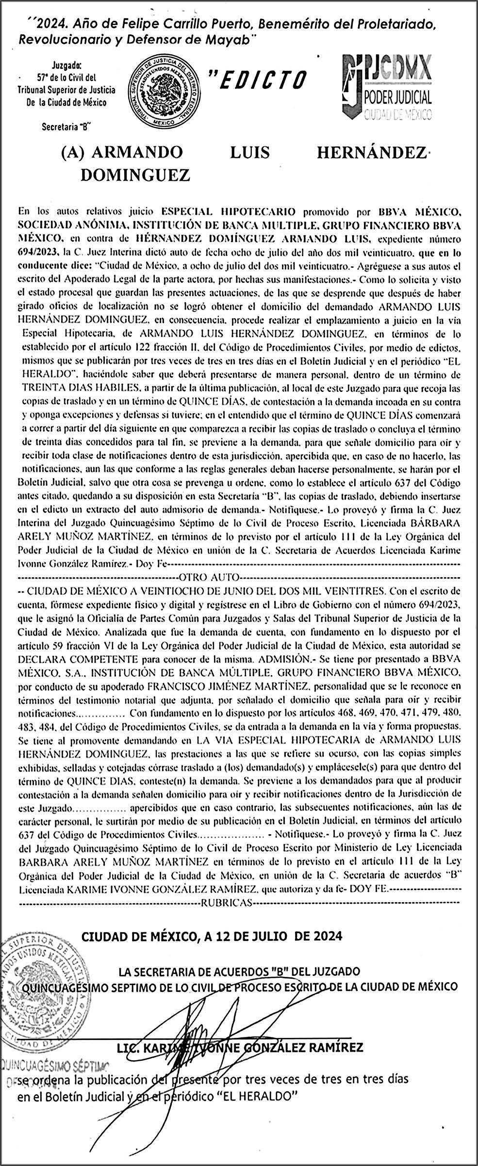 DIRECTOR GENERAL Periódico El Heraldo de México. Editor Responsable: Alfredo González Castro, Número de Certificado de Reserva otorgado por el Instituto Nacional del Derecho de Autor: 04-2009-060419022100-101. Número de Certificado de Licitud de Título y Contenido: 16921. Domicilio de la Publicación: Av. Insurgentes Sur, No. 1271, piso 2, oficina 202, Extremadura Insurgentes, Benito Juárez, C.P. 03740. Impreso en LA CRÓNICA DIARIA, SA DE CV, Avenida Azcapotzalco La Villa 160, Colonia San Marcos, Alcaldía Azcapotzalco, Ciudad de México, CP 02020. Distribuidores: ARREDONDO E HIJOS DISTRIBUIDORA, SA de CV, Iturbide 18 local D, Colonia Centro de la Ciudad de México Área 4, Alcaldía Cuauhtémoc, Ciudad de México, CP 06040. ELIZABETH IVONNE GUTIÉRREZ ORTIZ, Callejón 2o de la Luz 52, Departamento 4, Interior 1, Colonia Anáhuac II Sección, Alcaldía Miguel Hidalgo, Ciudad de México, CP 11320. AEROVÍAS EMPRESA DE CARGO, SA de CV, Paseo de la Reforma 445, Piso 9,