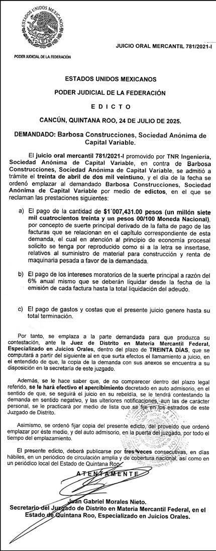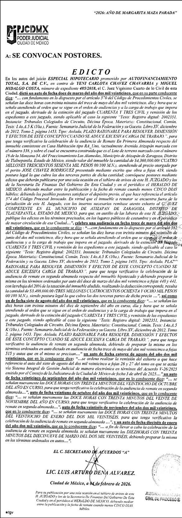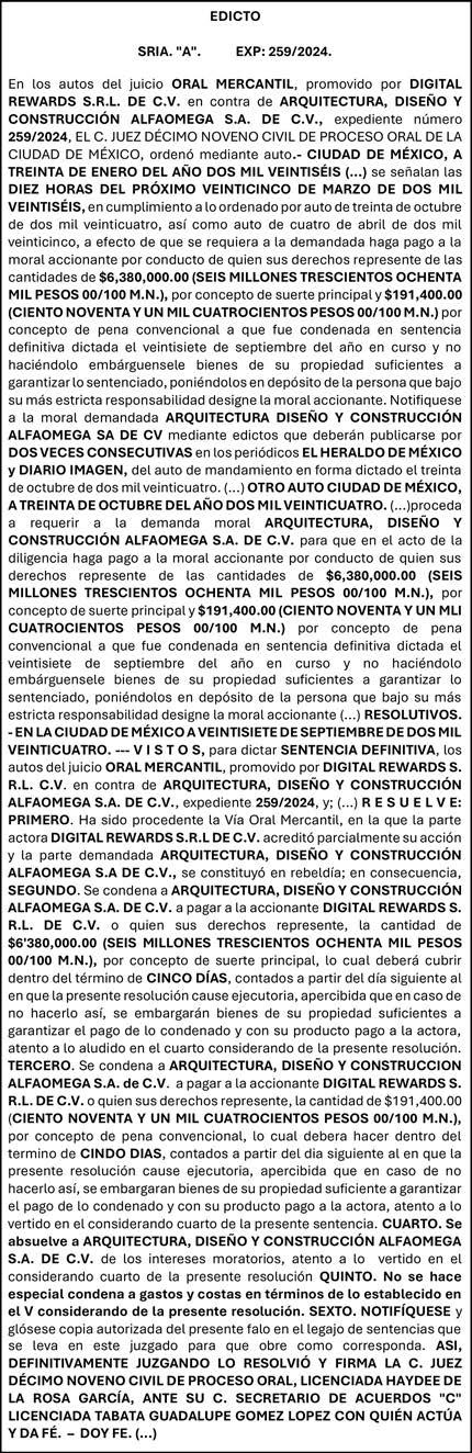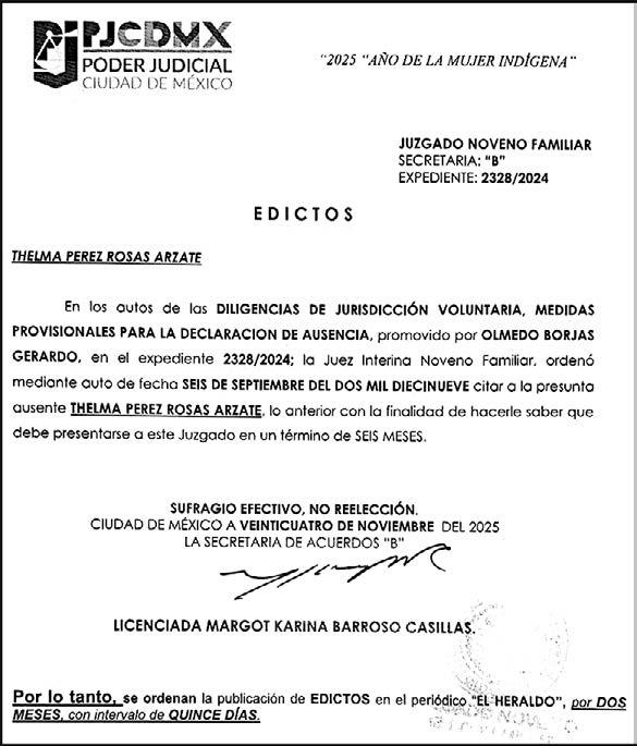 Responsable; ALFREDO GONZÁLEZ CASTRO Reserva de Derechos al Uso Exclusivo: 04-2009-060419022100-101 Certificado de Licitud de Titulo y Contenido: 16,921 Actualización del Registro en el Padrón Nacional de Medios Impresos de la Secretaría de Gobernación: 2 de octubre de 2024. Impreso por: LA CRÓNICA DIARIA, SA DE CV, Avenida Azcapotzalco La Villa 180, Colonia San Marcos, Alcaldía Azcapotzalco, Ciudad de México, CP 02020. Distribuidores: ARREDONDO E HIJOS DISTRIBUIDORA, SA de CV, Iturbide 18 local D, Colonia Centro de la Ciudad de México Área 4, Alcaldía Cuauhtémoc, Ciudad de México, CP 06040. OMAR GUTIÉRREZ RIVERO Calle Lago Chiem 142 A