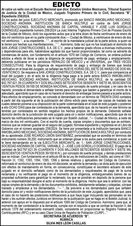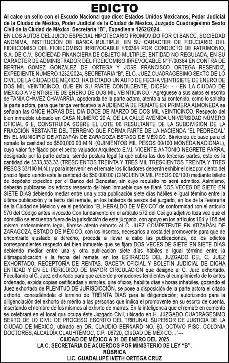 Periódico El Heraldo de México. Editor Responsable: Alfredo González Castro, Número de Certificado de Reserva otorgado por el Instituto Nacional del Derecho de Autor: 04-2009-060419022100-101. Número de Certificado de Licitud de Título y Contenido: 16921. Domicilio de la Publicación: Av. Insurgentes Sur, No. 1271, piso 2, oficina 202, Extremadura Insurgentes, Benito Juárez, C.P. 03740. Impreso en LA CRÓNICA DIARIA, SA DE CV, Avenida Azcapotzalco La Villa 160, Colonia San Marcos, Alcaldía Azcapotzalco, Ciudad de México, CP 02020. Distribuidores: ARREDONDO E HIJOS DISTRIBUIDORA, SA de CV, Iturbide 18 local D, Colonia Centro de la Ciudad de México Área 4, Alcaldía Cuauhtémoc, Ciudad de México, CP 06040. ELIZABETH IVONNE GUTIÉRREZ ORTIZ, Callejón 2o de la Luz 52, Departamento 4, Interior 1, Colonia Anáhuac II Sección, Alcaldía Miguel Hidalgo, Ciudad de México, CP 11320. AEROVÍAS EMPRESA DE CARGO, SA de CV, Paseo de la Reforma 445, Piso 9, Colonia Cuauhtémoc, alcaldía Cuauhtémoc, Ciudad de México, CP 06000, Publicación Diaria No. 2804, martes 18 de febrero de 2025.
