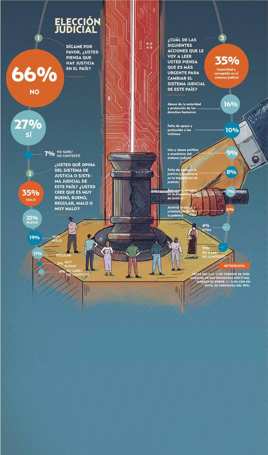 ted piensa que hay justicia en el país?”, 66% respondió que “no”; 27% dijo que “sí” y 7%, “no sabe/no contestó”. La siguiente pregunta fue: “¿Usted qué opina del sistema de justicia o sistema judicial del país? ¿Usted cree que es muy bueno, bueno, malo o muy malo?”, 35% opinó que “malo”; 23%,“bueno”; 19%, “muy malo”; 17%, “regular”; 2%, “muy bueno” y 4%, “no sabe/no contestó”. El último cuestionamiento fue: “¿Cuál de las siguientes acciones que le voy a leer usted piensa que es más urgente para cambiar en el sistema judicial del país?”, 35% dijo que la “impunidad y corrupción del sistema judicial”; 16% consideró que el “abuso de la autoridad y protección de los derechos humanos”.