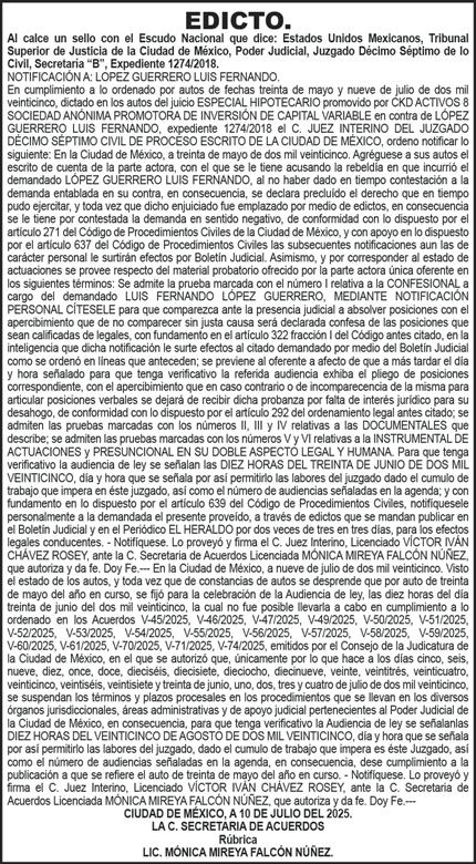 Periódico El Heraldo de México. Editor Responsable: Alfredo González Castro, Número de Certificado de Reserva otorgado por el Instituto Nacional del Derecho de Autor: 04-2009-060419022100-101. Número de Certificado de Licitud de Título y Contenido: 16921. Domicilio de la Publicación: Av. Insurgentes Sur, No. 1271, piso 2, oficina 202, Extremadura Insurgentes, Benito Juárez, C.P. 03740. Impreso en LA CRÓNICA DIARIA, SA DE CV, Avenida Azcapotzalco La Villa 160, Colonia San Marcos, Alcaldía Azcapotzalco, Ciudad de México, CP 02020. Distribuidores: ARREDONDO E HIJOS DISTRIBUIDORA, SA de CV, Iturbide 18 local D, Colonia Centro de la Ciudad de México Área 4, Alcaldía Cuauhtémoc, Ciudad de México, CP 06040. ELIZABETH IVONNE GUTIÉRREZ ORTIZ, Callejón 2o de la Luz 52, Departamento 4, Interior 1, Colonia Anáhuac II Sección, Alcaldía Miguel Hidalgo, Ciudad de México, CP 11320. AEROVÍAS EMPRESA DE CARGO, SA de CV, Paseo de la Reforma 445, Piso 9, Colonia Cuauhtémoc, alcaldía Cuauhtémoc, Ciudad de México, CP 06000 Publicación Diaria No. 2986, martes 19 de agosto de 2025. EL