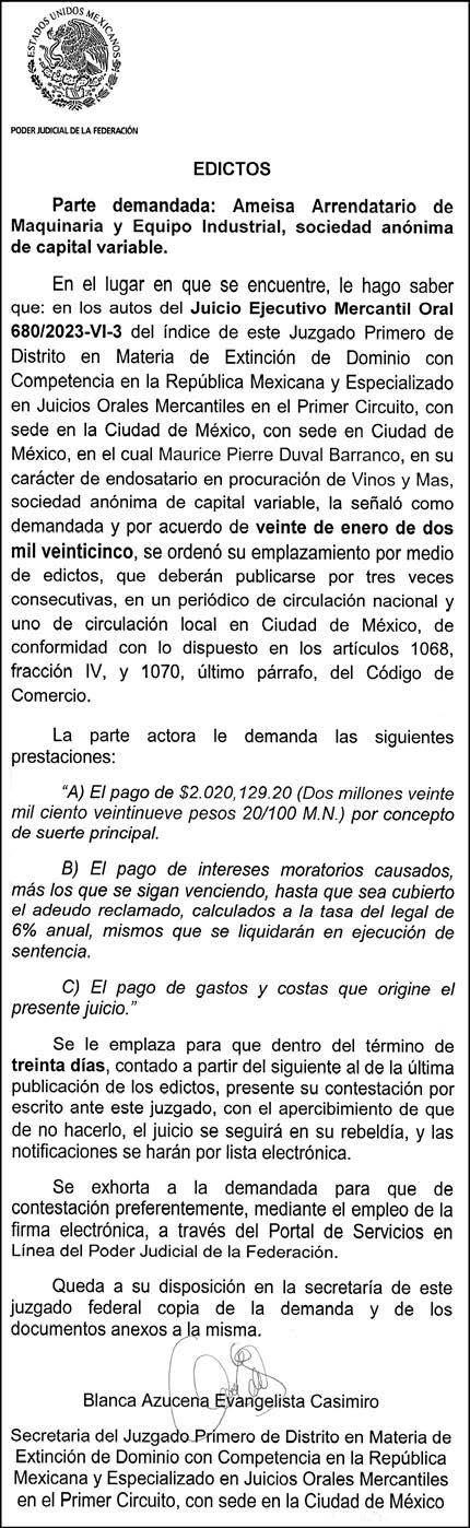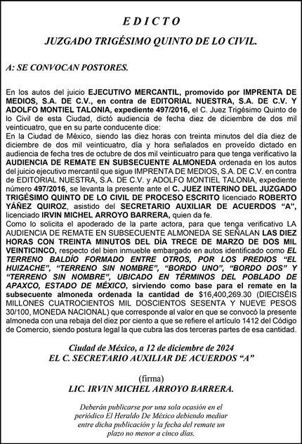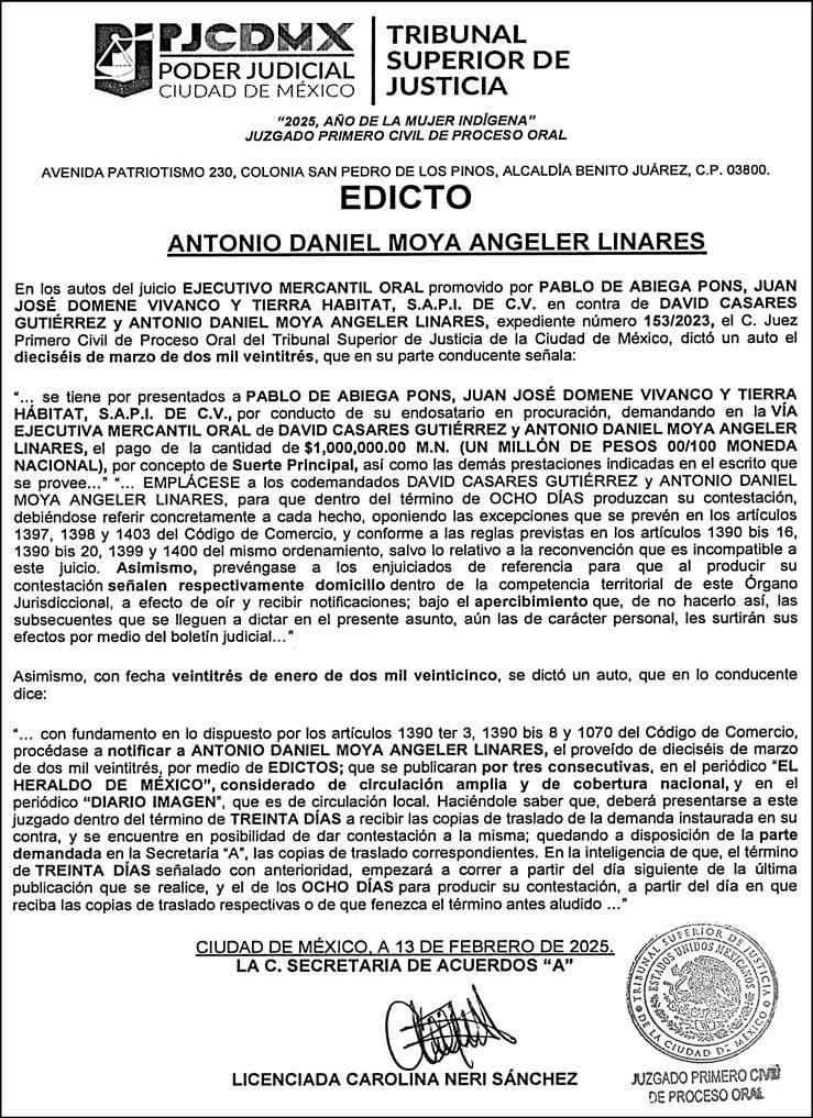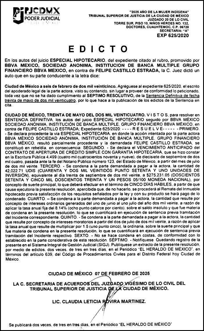 Periódico El Heraldo de México. Editor Responsable: Alfredo González Castro, Número de Certificado de Reserva otorgado por el Instituto Nacional del Derecho de Autor: 04-2009-060419022100-101. Número de Certificado de Licitud de Título y Contenido: 16921. Domicilio de la Publicación: Av. Insurgentes Sur, No. 1271, piso 2, oficina 202, Extremadura Insurgentes, Benito Juárez, C.P. 03740. Impreso en LA CRÓNICA DIARIA, SA DE CV, Avenida Azcapotzalco La Villa 160, Colonia San Marcos, Alcaldía Azcapotzalco, Ciudad de México, CP 02020. Distribuidores: ARREDONDO E HIJOS DISTRIBUIDORA, SA de CV, Iturbide 18 local D, Colonia Centro de la Ciudad de México Área 4, Alcaldía Cuauhtémoc, Ciudad de México, CP 06040. ELIZABETH IVONNE GUTIÉRREZ ORTIZ, Callejón 2o de la Luz 52, Departamento 4, Interior 1, Colonia Anáhuac II Sección, Alcaldía Miguel Hidalgo, Ciudad de México, CP 11320. AEROVÍAS EMPRESA DE CARGO, SA de CV, Paseo de la Reforma 445, Piso 9, Colonia Cuauhtémoc, alcaldía Cuauhtémoc, Ciudad de México, CP 06000 Publicación Diaria No. 2811, martes 25 de febrero de 2025.