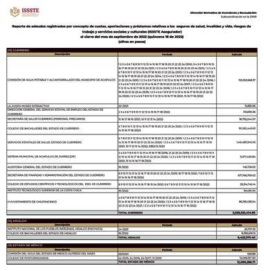 Los adeudos han ido incremen tando año con año, en enero de 2021 al ISSSTE le debían 64 mil millones de pesos, y para septiem bre de 2022 se incrementó a 75 mil 529 millones 450 mil 481 pesos, es decir, en 21 meses aumentó más de 12 mil millones de pesos.
