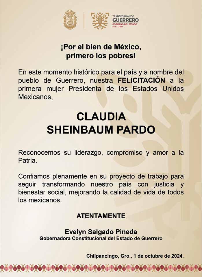 VA A SU PRIMERA ENCOMIENDA Una de las primeras acciones de Claudia Sheinbaum Pardo como Presidenta de México es una visita a Acapulco, Guerrero, para atender la emergencia que se vive en dicho puerto por el huracán John “Aprovecho para decir que el día de mañana por la tarde estaremos en Acapulco para dar continuidad a la atención inmediata que ha dado el gobierno de México y apoyaremos, como siempre lo hemos hecho como gobiernos humanistas, a todas y todos los damnificados de Guerrero y de otros estados”, informó la presidenta de México. Se contempla que después de su primera conferencia matutina, se traslade a Acapulco