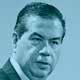 Se le ve sentado en mangas de camisa en la esquina de una gran mesa de trabajo, la mano derecha con un bolígrafo sobre sus labios y la cabeza inclinada sobre una gruesa carpeta ,sobre cuyas hojas resalta la palabra “borrador”.