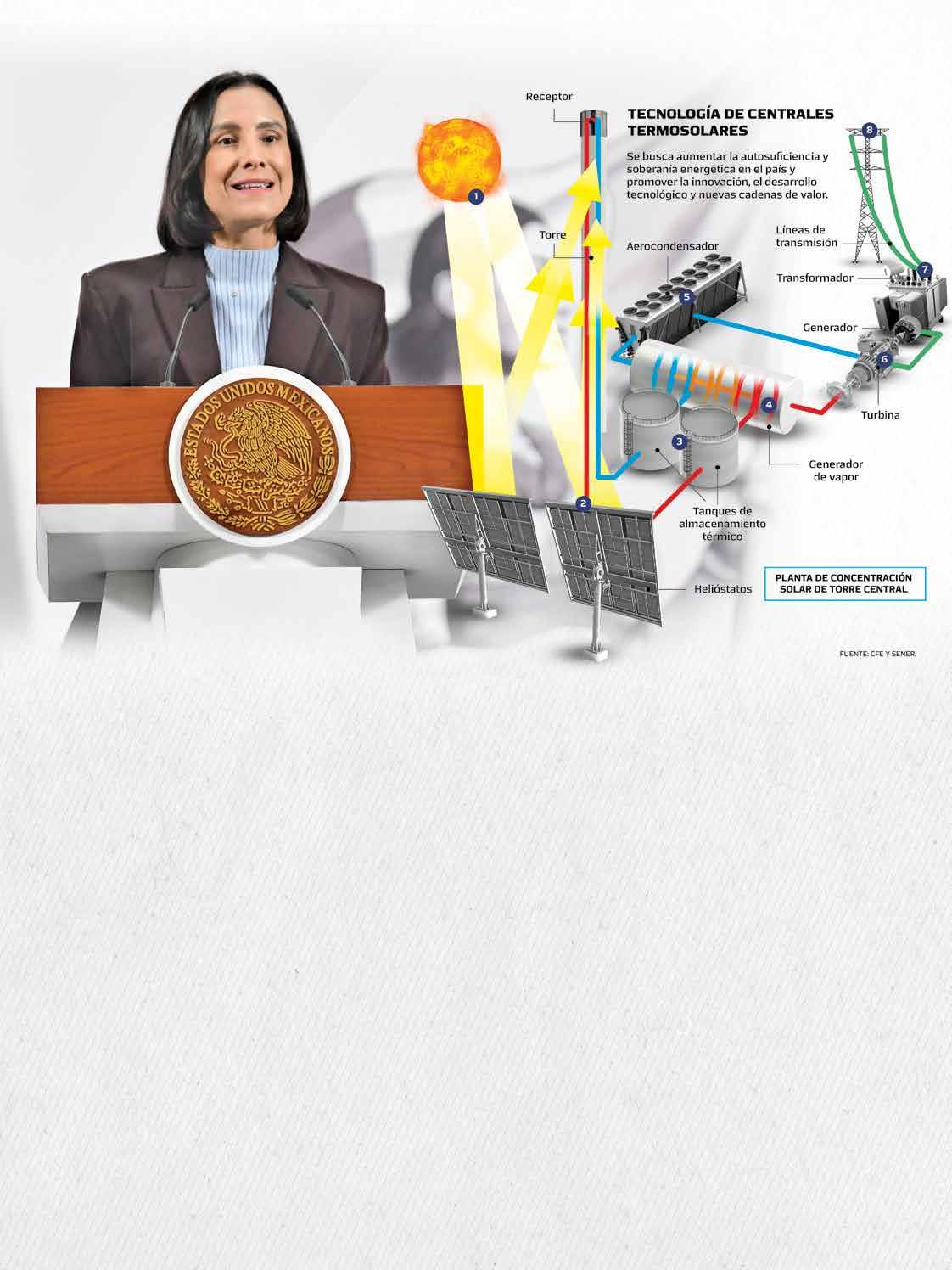 › Un gran paso hacia las energías renovables se dio a conocer ayer: se construirá en Baja California Sur una planta termosolar, con una inversión de 800 millones de dólares. El proyecto corre a cargo de la Secretaría de Energía, encabezada por Luz Elena González y de la Comisión Federal de Electricidad, dirigida por Esther Calleja