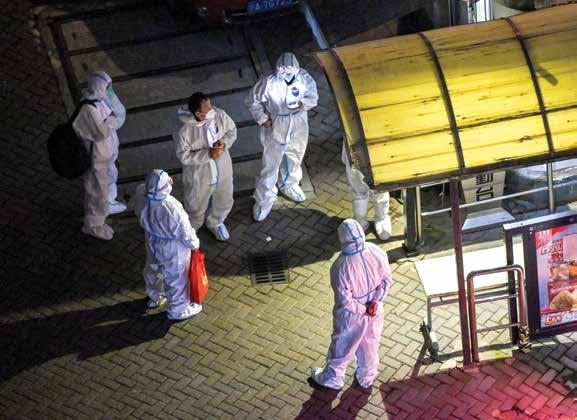 ● Personal de salud de China espera en la entrada de un conjunto habitacional en el distrito de Jing'an de Shanghai. En varias ciudades chinas flexibilizaron este viernes las medidas anticovid que provocaron protestas. El propio presidente Xi Jinping dio el visto bueno a esas iniciativas alegando que la actual ola de la pandemia es “menos letal”. AFP