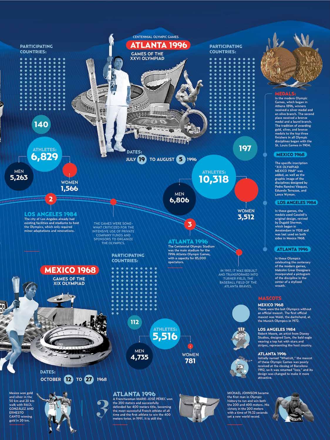 The United States and Mexico have both hosted the glorious Olympic Games. The United States has hosted four times: St. Louis in 1904, Los Angeles in 1932 and 1984, and Atlanta in 1996. Mexico hosted in 1968. Here are some facts about the three most recent editions in these countries.
