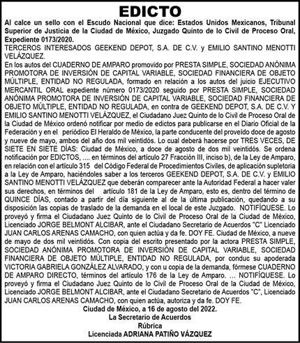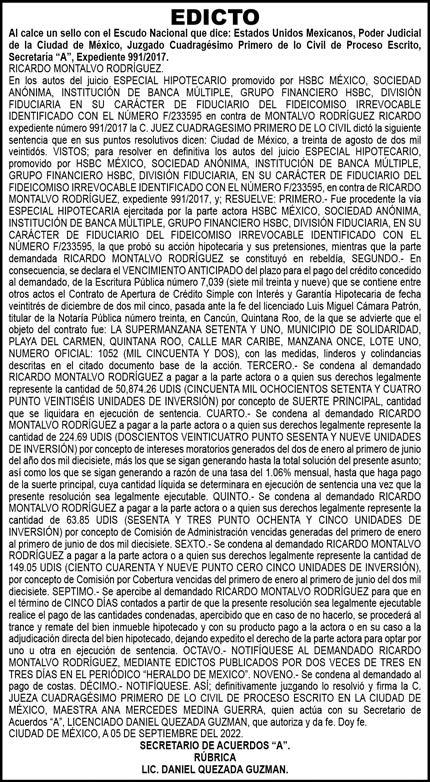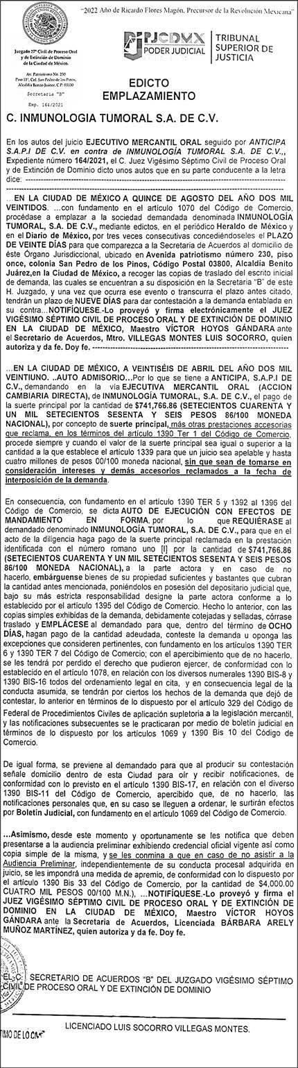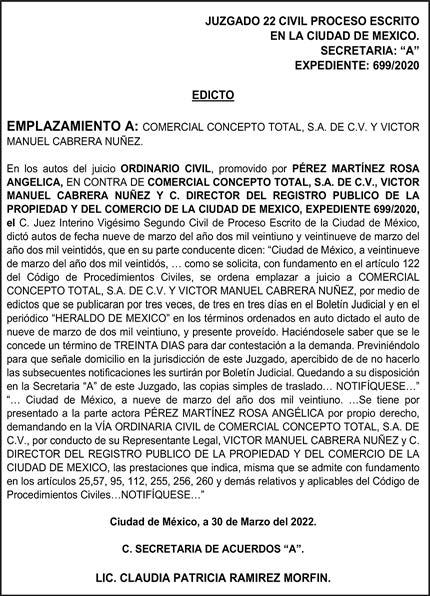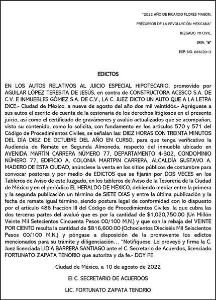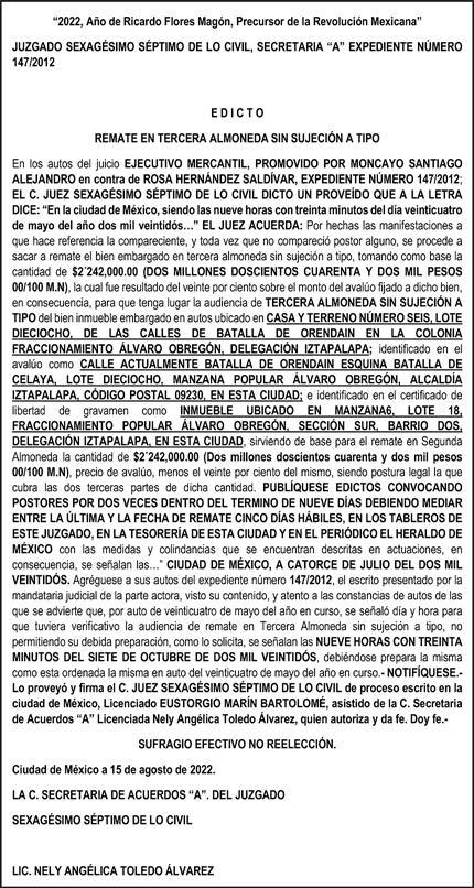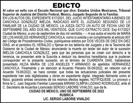 Diario El Heraldo de México. Editor responsable: Alfredo González Castro. Número de Certificado de Reserva otorgado por el Instituto Nacional del Derecho de Autor 04-2009-060419022100-101. Número de Certificado de Licitud de título y Contenido No.16921. Domicilio de la Publicación: Paseo de la Reforma No. 250, Piso 24, Colonia Juárez, Del. Cuauhtémoc, C.P. 06600, Ciudad de México. Imprenta: Impresora de Periódicos Diarios, S. de R.L. de C.V., con domicilio en Acalotenco No. 80, Colonia Barrio Santo Tomás, Azcapotzalco, Ciudad de México, C.P 02040. Publicación Diaria. Todos los derechos están reservados. Queda estrictamente prohibida la reproducción total o parcial de los contenidos e imágenes de esta publicación sin previa autorización de El Heraldo de México. El contenido de los artículos es responsabilidad exclusiva de los autores.