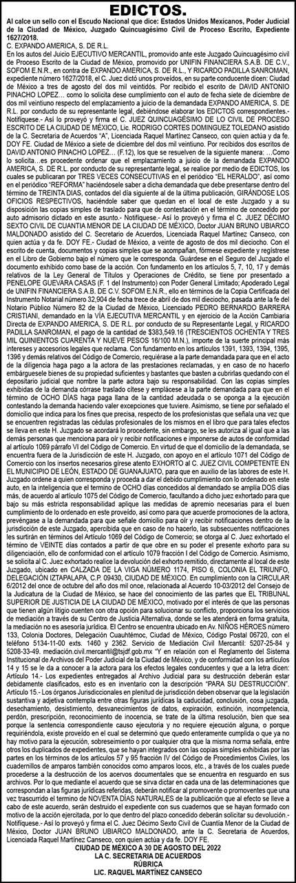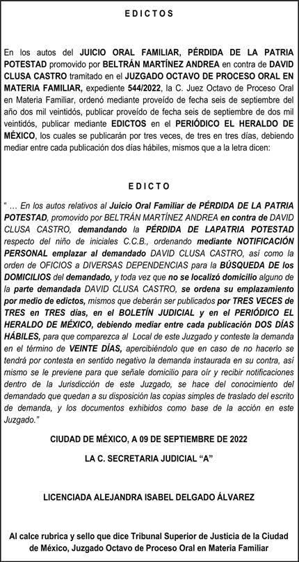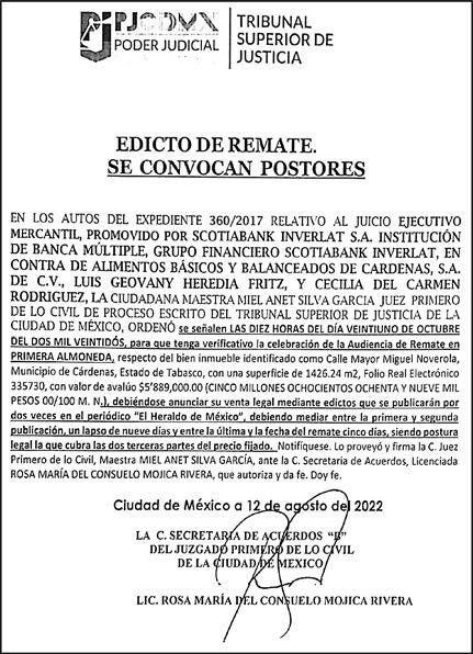 Diario El Heraldo de México. Editor responsable: Alfredo González Castro. Número de Certificado de Reserva otorgado por el Instituto Nacional del Derecho de Autor 04-2009-060419022100-101. Número de Certificado de Licitud de título y Contenido No.16921. Domicilio de la Publicación: Paseo de la Reforma No. 250, Piso 24, Colonia Juárez, Del. Cuauhtémoc, C.P. 06600, Ciudad de México. Imprenta: Impresora de Periódicos Diarios, S. de R.L. de C.V., con domicilio en Acalotenco No. 80, Colonia Barrio Santo Tomás, Azcapotzalco, Ciudad de México, C.P 02040. Publicación Diaria. Todos los derechos están reservados. Queda estrictamente prohibida la reproducción total o parcial de los contenidos e imágenes de esta publicación sin previa autorización de El Heraldo de México. El contenido de los artículos es responsabilidad exclusiva de los autores.