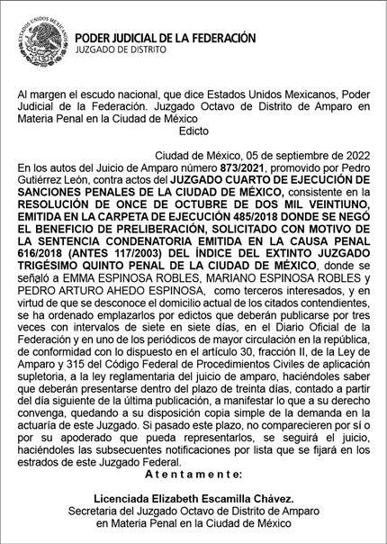 “Acuerdo emitido el 22 de septiembre del presen te año por la Comisión de Justicia Partidaria del Par tido Revolucionario Insti tucional en el expediente CNJP-PS-CMX-049/2022 relacionado con la denuncia presentada por el actor en contra de Alejandro Moreno Cárdenas, en su carácter de presidente del Comité Eje cutivo Nacional del citado instituto político, a fin de que sea destituido de su cargo”, precisa el juicio.