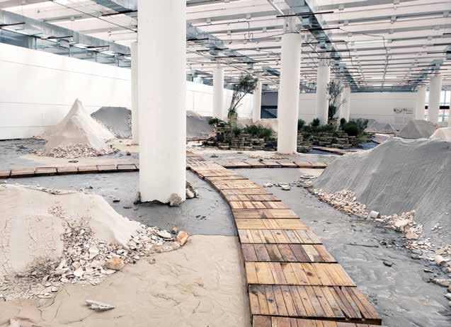 Entrando a la sala del Museo Universitario de Ciencias y Artes (MUCA) de la UNAM se despliegan vistas a un paisaje artificial, compuesto por la modelación geomorfo lógica de la cuenca de México, cubierta por desechos de cerámica. En medio de este escenario, estructurado por senderos sobre bases de madera, se acumulan, en orden aleatorio, cientos de charolas de unicel. En sus per foraciones crece una vegetación silvestre, regada desde el techo con un sistema de nebulización.