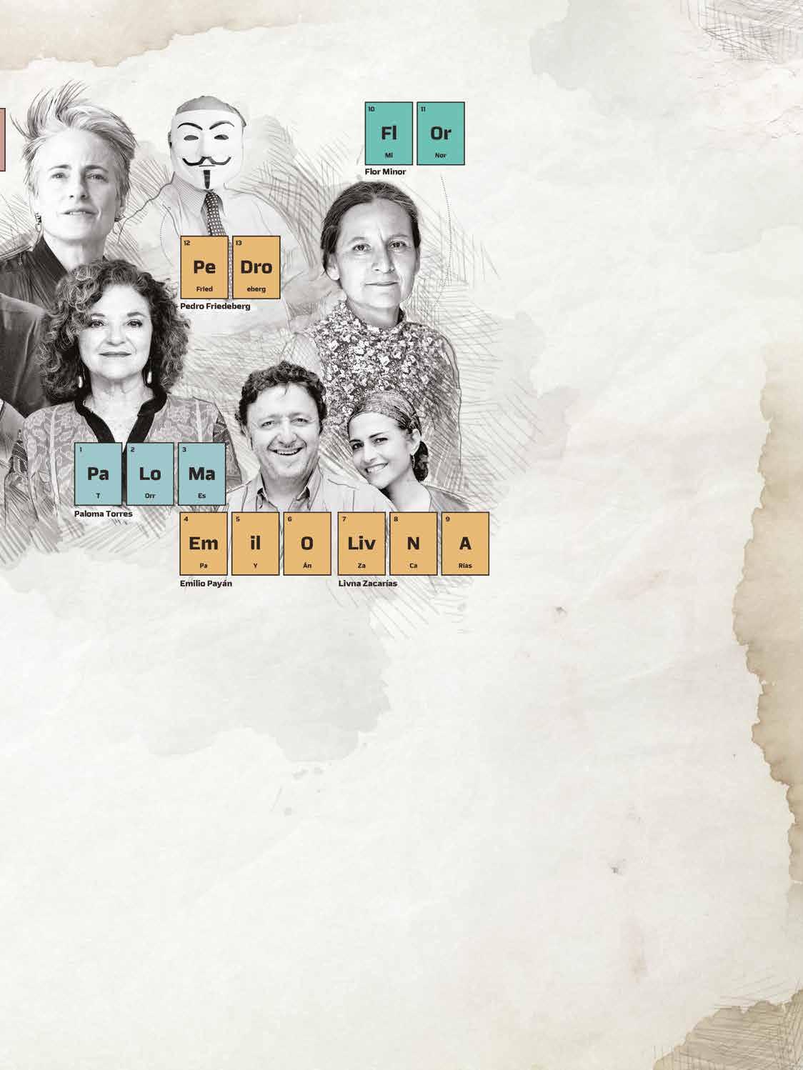 En 2018, enterados de que la Unesco había declara do 2019 como Año Internacional de la Tabla Periódica de los Elementos Químicos, y gracias al apoyo que recibimos de la Convocatoria de Arte, Ciencia y Tec nologías (ACT) de la UNAM, invitamos a 121 creadores —la mayoría artistas plásticos, además de un astróno mo, un bioquímico, tres músicos y tres fotógrafos— a plasmar su interpretación personal de un elemento químico en un bastidor de 60 x 60 centímetros.
