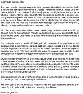 “Uno debe saber cuándo retirarse”, escribió en la misiva que ella misma leyó ayer en la mañanera y agregar una bre ve explicación: “Como lo platicamos desde el 26 de julio y lo reiteré el 9 de septiembre, mi oportunidad de aportarle al equipo está agotada; me paso a la porra, desde donde seguiré con ánimo al equipo”.