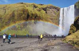 nos recoge temprano cerca del hotel para comenzar la aventura. Después de mane jar 130 kilómetros llegamos a la primera parada: Seljalandsfoss, las cascadas más famosas del país que resultan memorables no sólo por sus 60 metros de altura, sino porque puedes admirarlas desde diferen tes perspectivas, incluida una desde atrás, gracias a un camino entre rocas y caver nas. Más adelante, visitamos las cascadas de Skógafoss, que nacen de dos glaciares –Eyjafjallajokull y Myrdalsjokull–, y en donde, durante los días soleados, un arcoi ris se dibuja ante la base.