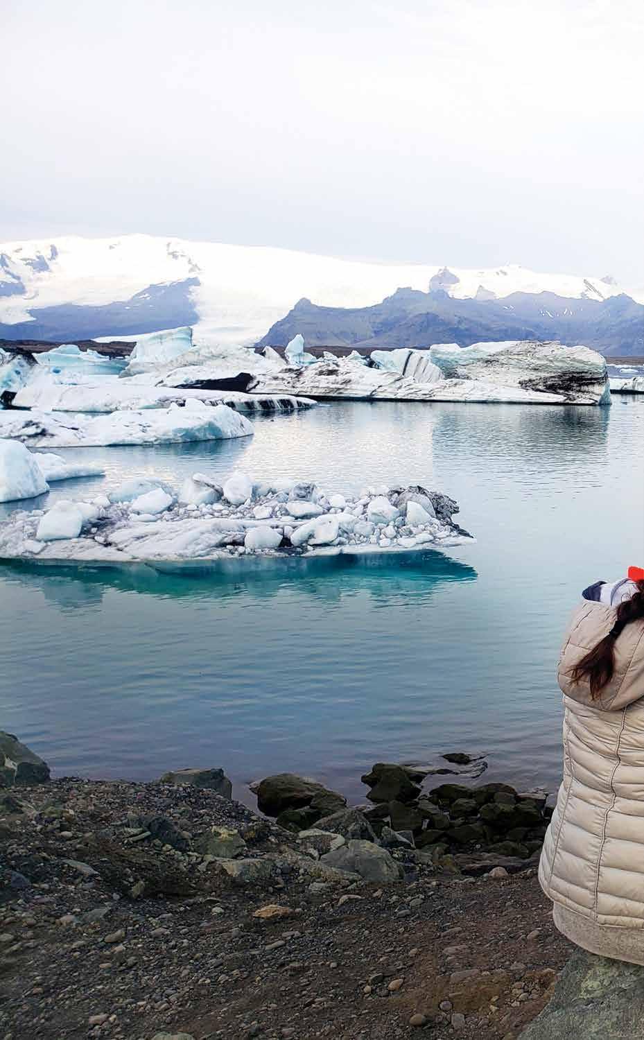DÍA 2: COLOSO NATURAL Despertamos temprano para manejar 51 kilómetros a Jökulsárlón. Alberto nos explica que, año con año, la superficie de la impresionante laguna glaciar se ha redu cido en consecuencia del cambio climático; no podemos dejar de sentir tristeza de que este lugar en donde desfilan inmensos blo ques de hielo, y es casa de peces y focas, pueda desaparecer en unos años. Es momento de enfilarnos hacia la última parada del día y, también, la más esperada: la caminata en uno de los glaciares situado dentro del Parque Nacional Vatnajökull, nombrado Patrimonio de la Humanidad de la UNESCO, y que cubre 13 por ciento de Islandia. Después de que Alberto nos proporciona el equipo necesario y nos da una capacitación, empezamos el hike hacia los inmensos bloques de hielo. Ya casi en la cima, tomamos decenas de fotografías, pero sabiendo que ninguna podrá hacerle justicia al paisaje y que esta experiencia se guarda más bien en la memoria.