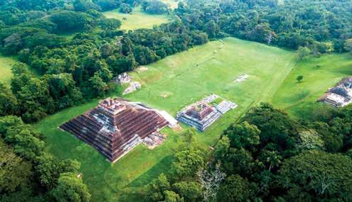 Esta ciudad maya estuvo ocupada poco más de mil años; ladrillos y estuco de cal de concha de ostión conforman sus imponentes pirámides. En este sitio existe una escultura modelada en estuco que representa al dios Itzamná, creador del Universo.