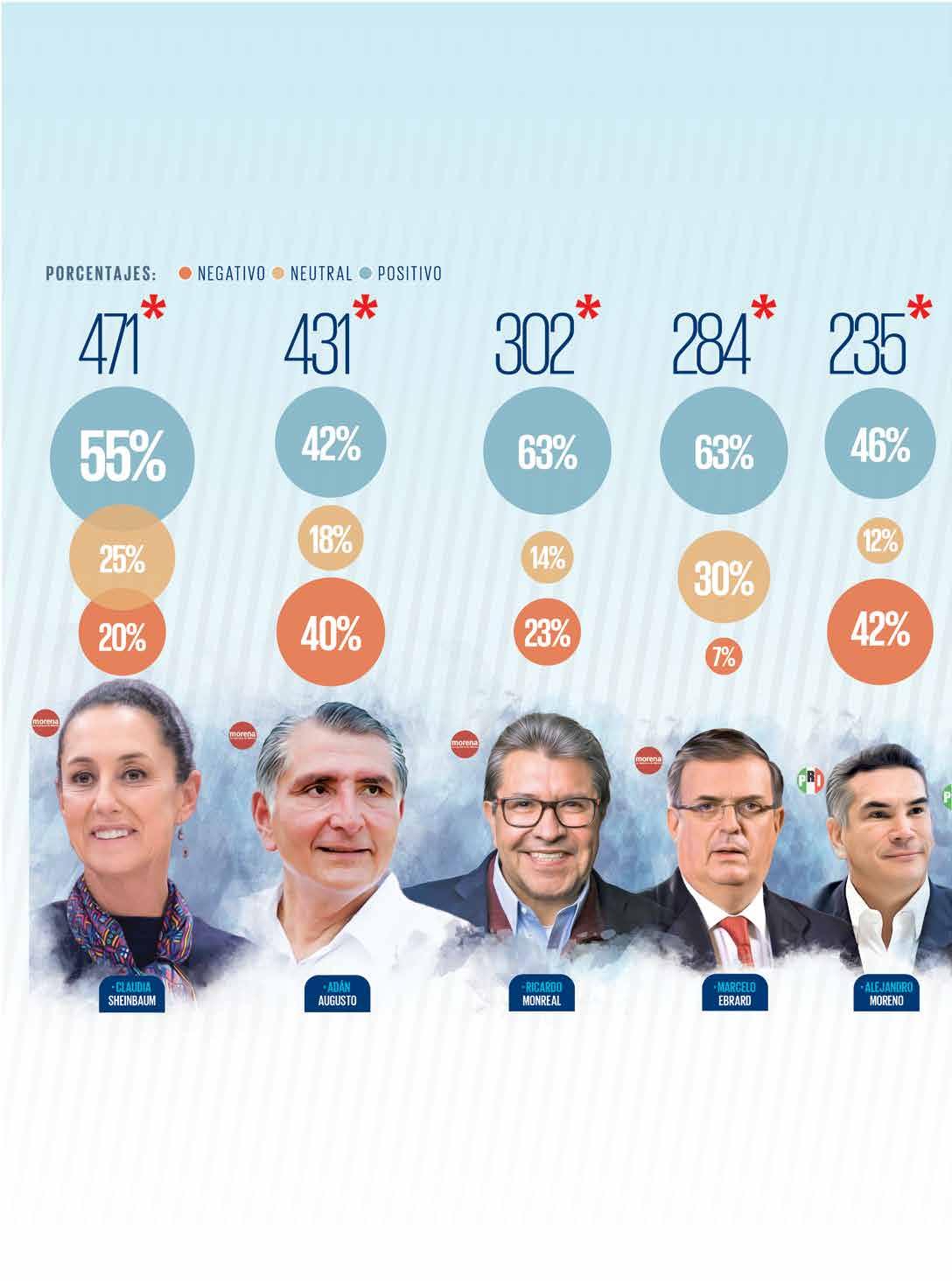 ● Respecto al feminicidio de Ariadna, Claudia Sheinbaum mostró firmeza y exhibió la evidencia para revelar las contradicciones de Uriel Carmona, fiscal de Morelos y se detuvo a los involucrados. Esto generó 21% de los reflectores. Sheinbaum destacó que los delitos de alto impacto bajaron 50.8%, respecto a 2019. Logró que el GP de México de la F1 se renovara hasta 2025. En temas presidenciables, aseguró que no se involucraría en el pleito de Layda Sansores y Ricardo Monreal.