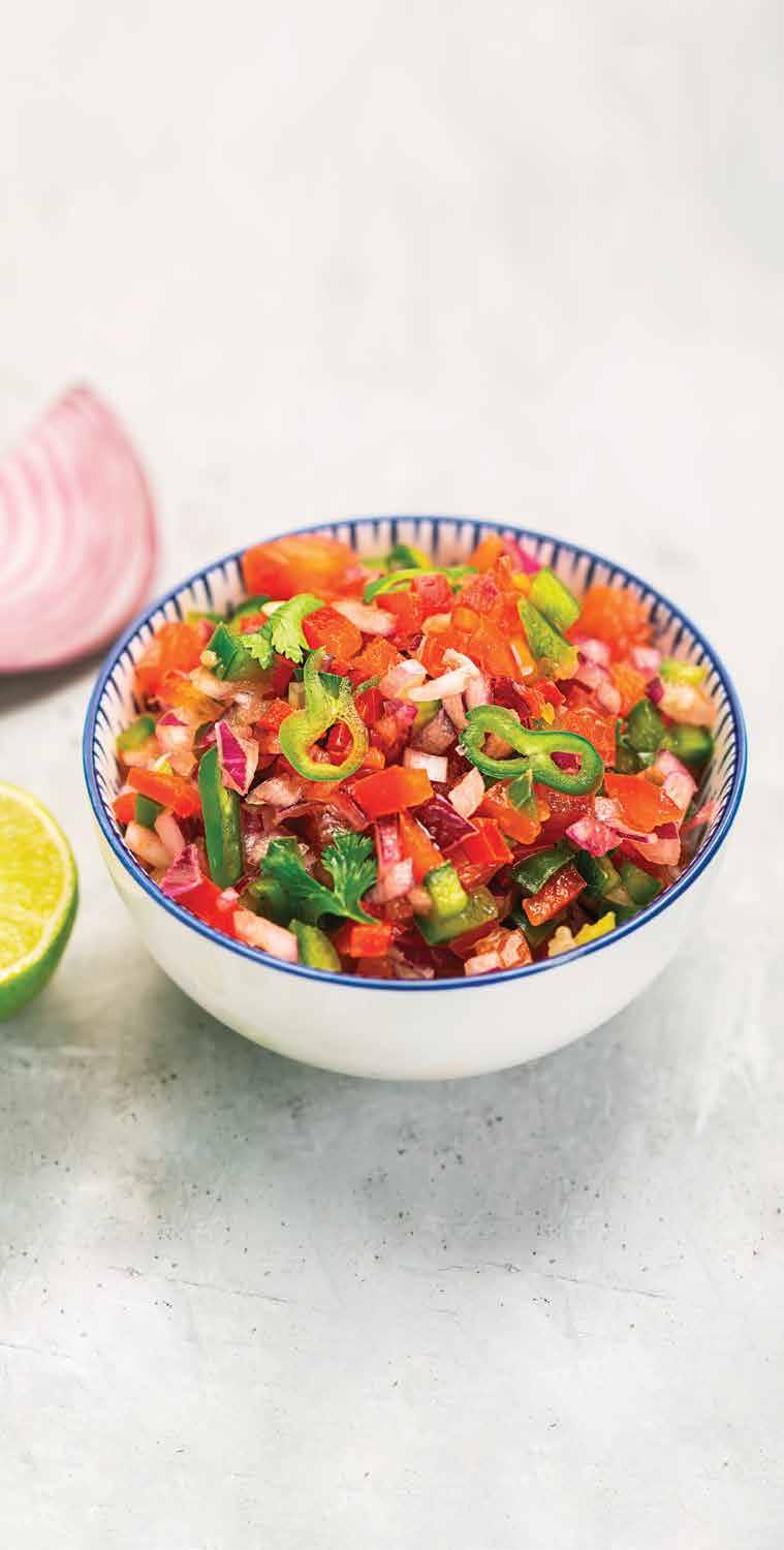Es una salsa que adereza an tojitos y que sirve de botana en sí misma. Los ingredientes princi pales son jitomate, cebolla y chile, al igual que la salsa mexicana que presume los colores de la bandera.