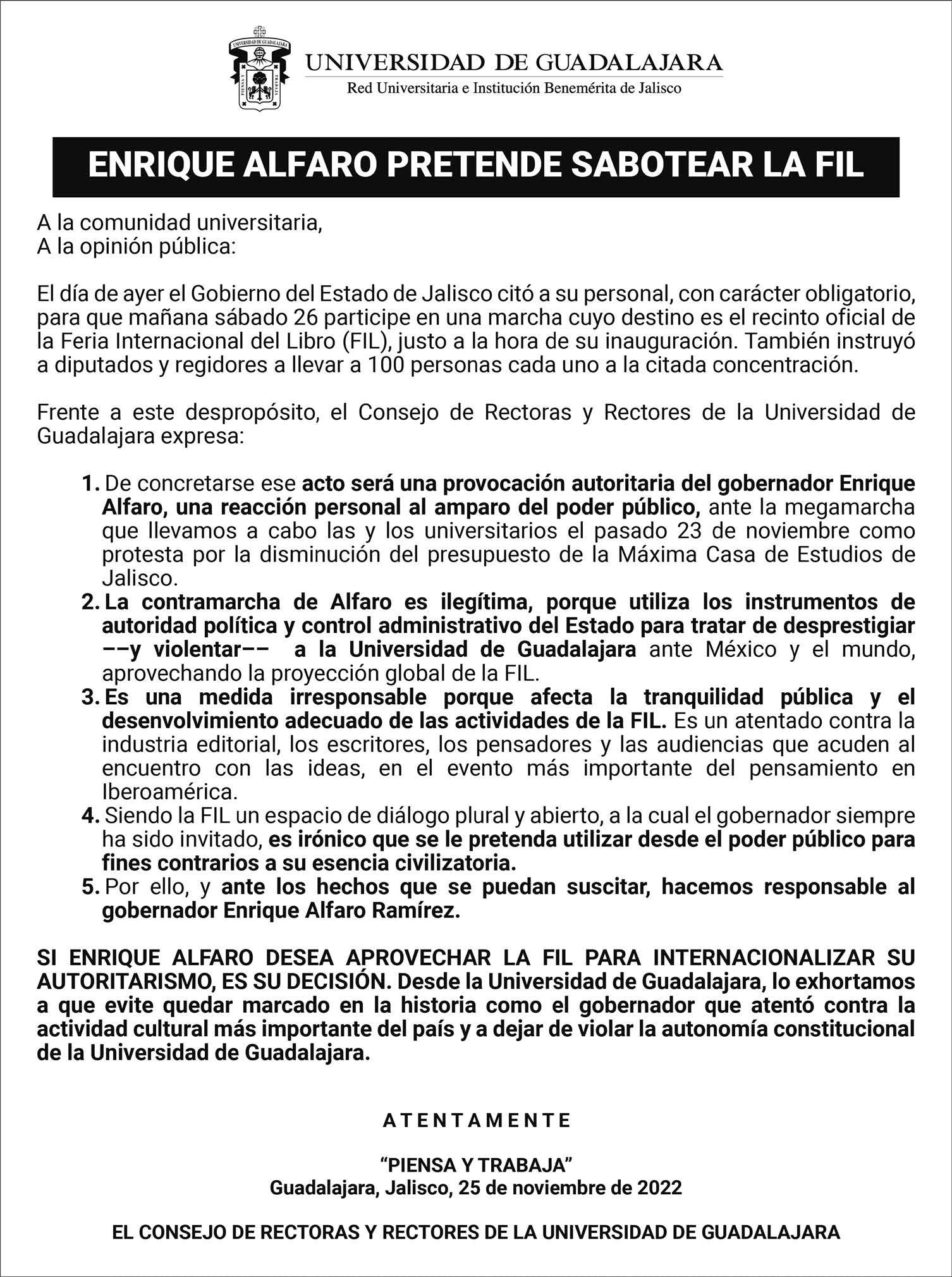 › En la Universidad de Guadalajara hay sospechas de que el gobernador Enri que Alfaro busca boicotear la Feria Internacional del Libro, la más im portante de habla hispana, que inicia el sábado. A la rec toría, a cargo de Ri cardo Villanueva, llegó información de que funcionarios del gobierno estatal alistan una marcha contra el evento, obvio coaccionando a subalternos.