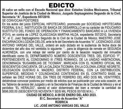 Diario El Heraldo de México. Editor responsable: Alfredo González Castro. Número de Certificado de Reserva otorgado por el Instituto Nacional del Derecho de Autor 04-2009-060419022100-101. Número de Certificado de Licitud de título y Contenido No.16921. Domicilio de la Publicación: Paseo de la Reforma No. 250, Piso 24, Colonia Juárez, Del. Cuauhtémoc, C.P. 06600, Ciudad de México. Imprenta: Impreso en Talleres de La Crónica Diaria , S.A. de C. V. Calzada Azcapotzalco La Villa No. 160 Barrio San Marcos , Alcaldia Azcapotzalco, CP 02020. Publicación Diaria. Todos los derechos están reservados. Queda estrictamente prohibida la reproducción total o parcial de los contenidos e imágenes de esta publicación sin previa autorización de El Heraldo de México. El contenido de los artículos es responsabilidad exclusiva de los autores.
