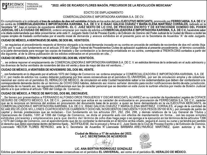 Diario El Heraldo de México. Editor responsable: Alfredo González Castro. Número de Certificado de Reserva otorgado por el Instituto Nacional del Derecho de Autor 04-2009-060419022100-101. Número de Certificado de Licitud de título y Contenido No.16921. Domicilio de la Publicación: Paseo de la Reforma No. 250, Piso 24, Colonia Juárez, Del. Cuauhtémoc, C.P. 06600, Ciudad de México. Imprenta: Impreso en Talleres de La Crónica Diaria , S.A. de C. V. Calzada Azcapotzalco La Villa No. 160 , Barrio San Marcos Alcaldia Azcapotzalco, CP 02020. Publicación Diaria. Todos los derechos están reservados. Queda estrictamente prohibida la reproducción total o parcial de los contenidos e imágenes de esta publicación sin previa autorización de El Heraldo de México. El contenido de los artículos es responsabilidad exclusiva de los autores.