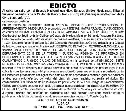 Diario El Heraldo de México. Editor responsable: Alfredo González Castro. Número de Certificado de Reserva otorgado por el Instituto Nacional del Derecho de Autor 04-2009-060419022100-101. Número de Certificado de Licitud de título y Contenido No.16921. Domicilio de la Publicación: Paseo de la Reforma No. 250, Piso 24, Colonia Juárez, Del. Cuauhtémoc, C.P. 06600, Ciudad de México. Imprenta: Impreso en Talleres de La Crónica Diaria , S.A. de C. V. Calzada Azcapotzalco La Villa No. 160 Barrio San Marcos , Alcaldia Azcapotzalco, CP 02020. Publicación Diaria. Todos los derechos están reservados. Queda estrictamente prohibida la reproducción total o parcial de los contenidos e imágenes de esta publicación sin previa autorización de El Heraldo de México. El contenido de los artículos es responsabilidad exclusiva de los autores.