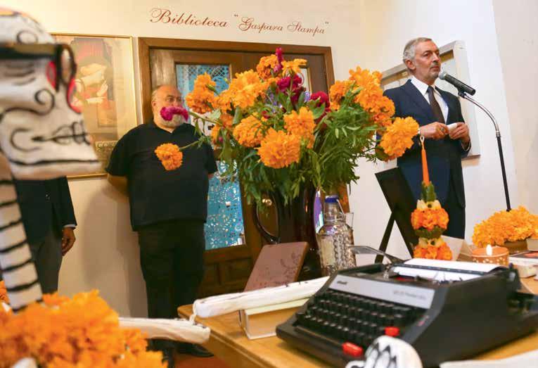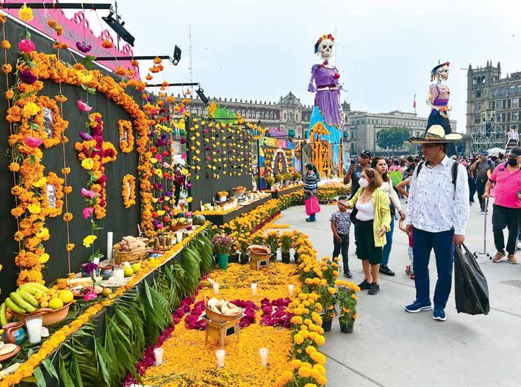● El Zócalo se llenó de altares, artesanías y 32 calaveras monumentales —de 12 metros de altura— que representan a las 32 entidades del país y su cosmovisión . También hay dos catrinas gigantes, para emular un campo se instalaron cinco mil 500 flores y se incorporaron cuatro torres de audio para ambientar con música distintiva del Día de Muertos. La Megaofrenda estará hasta el 2 de noviembre. C. NAVARRO