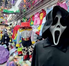 Otro de los personajes fa voritos es Michael Myers, el encargado de aterrorizar las películas de Halloween. El rostro de hule de este perso naje, Marco Méndez lo vende en 490 pesos, el traje com pleto está en 1,100 pesos el de adultos y el de niños cuesta 600 pesos. El joven, cuarta generación en el mercado, asegura que esta es la me jor temporada del año, más ahora que ya está cediendo la pandemia