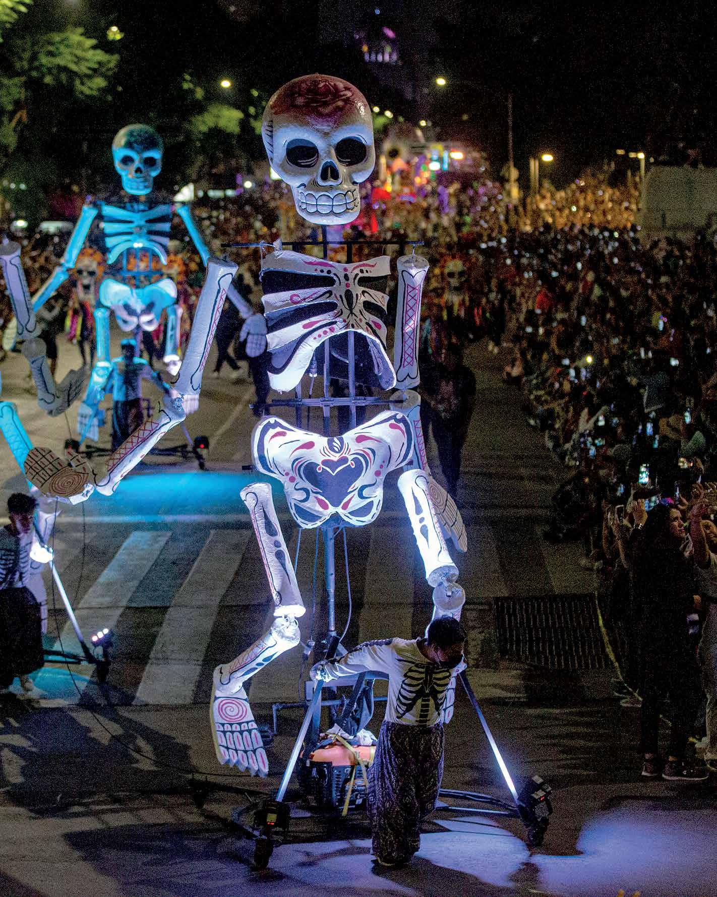 Catrinas, catrines, calaveras, cra neos, carros alegóricos, charros, diablos, alebrijes, calacas en zan cos, trajineras y globos llenaron de alegría a las miles de personas que se dieron cita sobre avenida Paseo de la Reforma desde muy temprano para disfrutar del Desfi le de Día de Muertos de la CDMX.