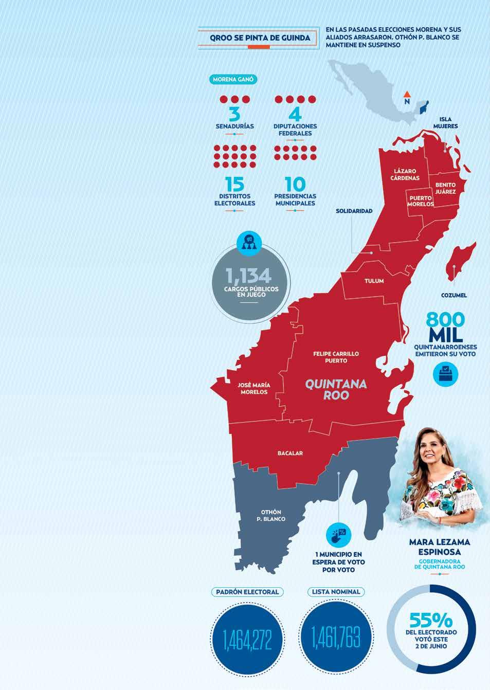 sólo quedarán dos para el PAN, dos para el PVEM, uno para MC y otro más el PRI; los cuatros restantes serán de Morena. En cuanto a los representantes de QRoo en la cámara alta y baja federal, las dos fórmulas para las senadurías de la coalición obtuvieron amplias victorias sobre sus oponentes, mismo caso en las diputaciones federales, en las que en los 4 distritos electorales obtuvieron la mayoría de los votos. La oposición reconoció la derrota, aunque algunos señalaron irregularidades.