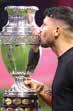 l El exfutbolista argentino colocó la emblemática copa en el campo del Mercedes-Benz Stadium, donde se disputó el juego inaugural.