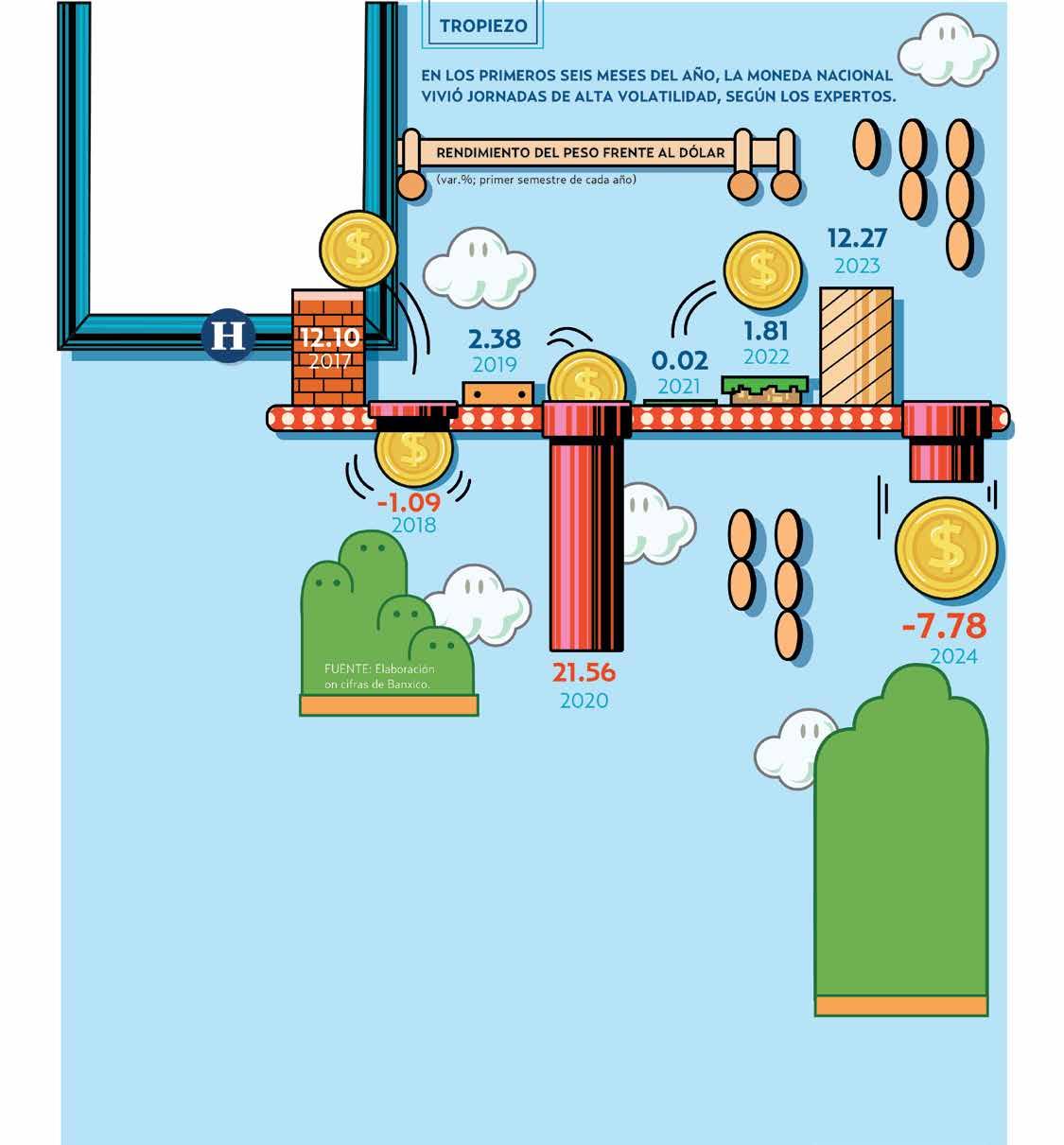 En el primer semestre de 2024 , la moneda mexicana registró una depreciación de 7.78 por ciento o 1.32 pesos respecto a la divisa estadounidense en sus operaciones en el mercado spot, ante una mayor aversión al riesgo, según cifras de Banco de México