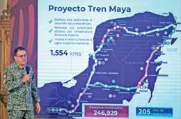 La ruta del tren de mil 554 kilómetros está dividida en siete tramos que pasan por Chiapas, Tabasco, Campeche, Yucatán y Quintana Roo, atraviesa 36 municipios con 34 estaciones, 10 centros de atención a visitantes, tres parques nacionales, seis hoteles y cuatro aeropuertos.
