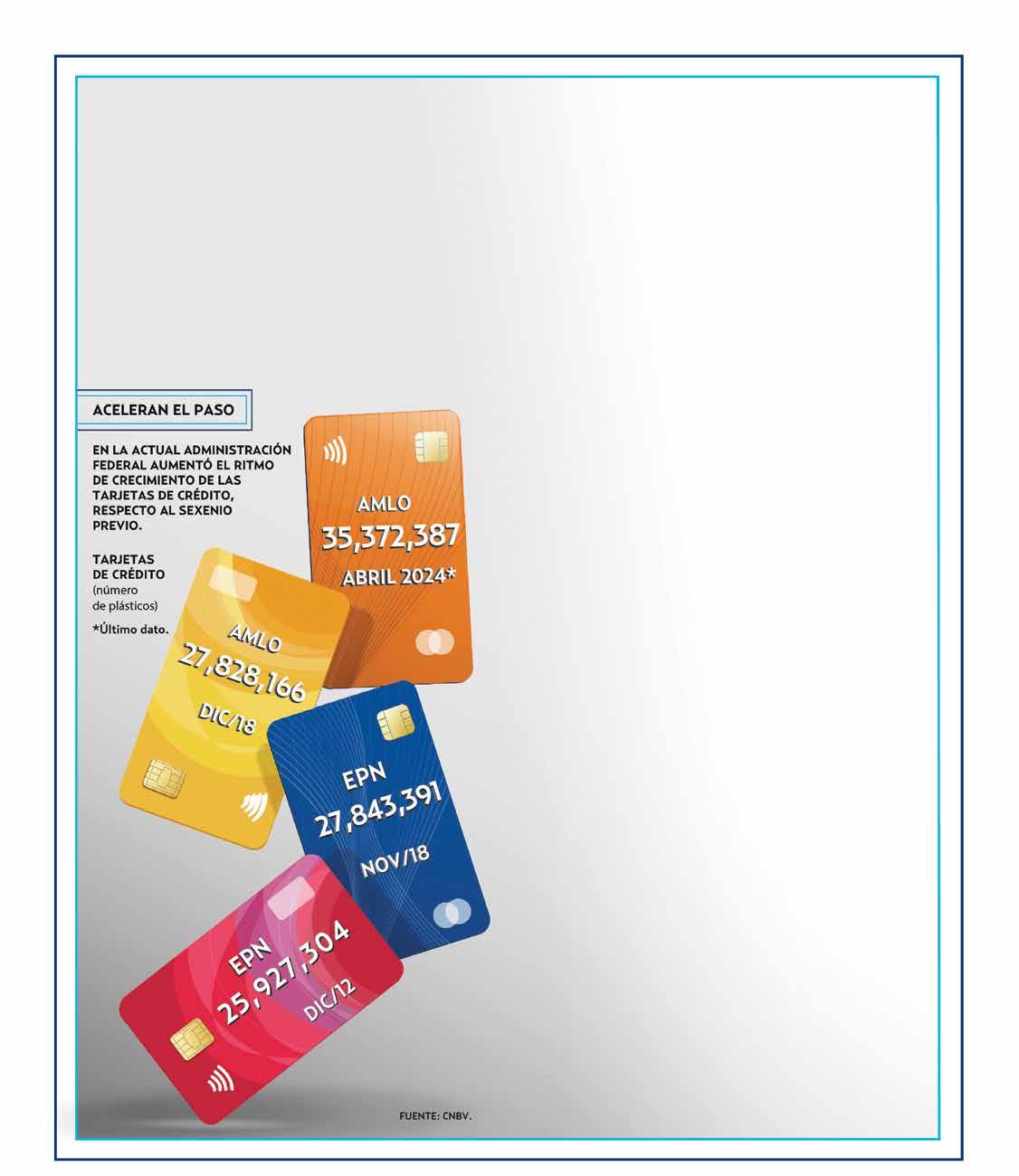 Así, de diciembre de 2018 a abril de 2024, lapso de la actual administración federal, el número de plásticos pasó de 27 millones 828 mil 166 a 35 millones 372 mil 387, esto es siete millones 544 mil 221 nuevos.