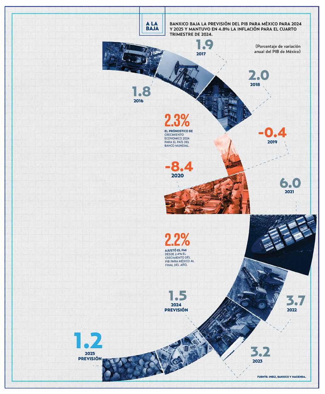 anco de México recortó a 1.5 de 2.4 por ciento su estimación d e crecimiento económico del país para 2024, ante la marcada debilidad que registra y la desaceleración del sector manufacturero en Estados Unidos, como el principal socio comercial del país. Esta es la tercera revisión a la baja consecutiva que realiza el Banco Central de su expectativa del Producto Interno Bruto para este año, al bajarla de 3 a 2.8 por ciento en febrero, y de 2.8 a 2.4 por ciento en mayo. Además se ubicó por debajo de la tasa de 1.7 por ciento en promedio estimada en la reciente Encuesta Citibanamex de Expectativas, en la cual participaron cerca de 35 instituciones financieras.