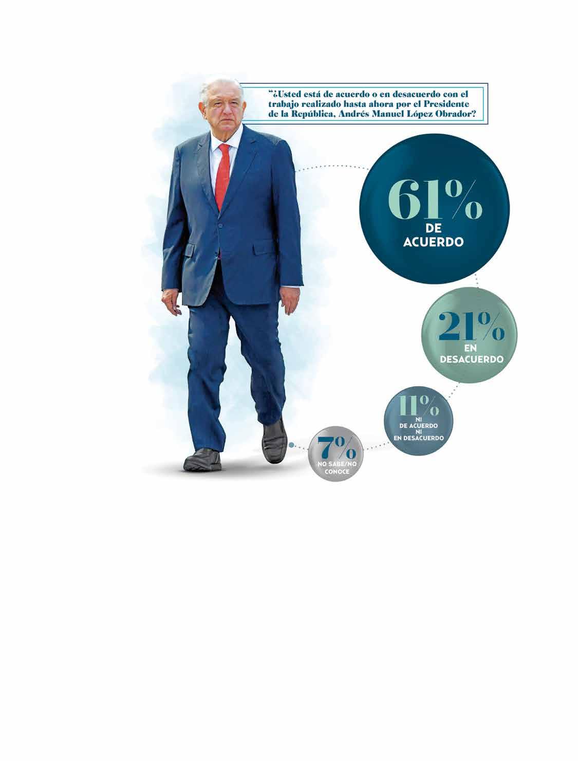 A la pregunta: “¿Usted está de acuerdo o en desacuerdo con el trabajo realizado hasta ahora por el Presidente de la República, Andrés Manuel López Obrador?”, 61 por ciento contestó “de acuerdo”; 21 por ciento, “en desacuerdo”; 11 por ciento, “ni de acuerdo ni en desacuerdo” y el resto de los ciudadanos consultados dijo que “no sabe/no conoce”.