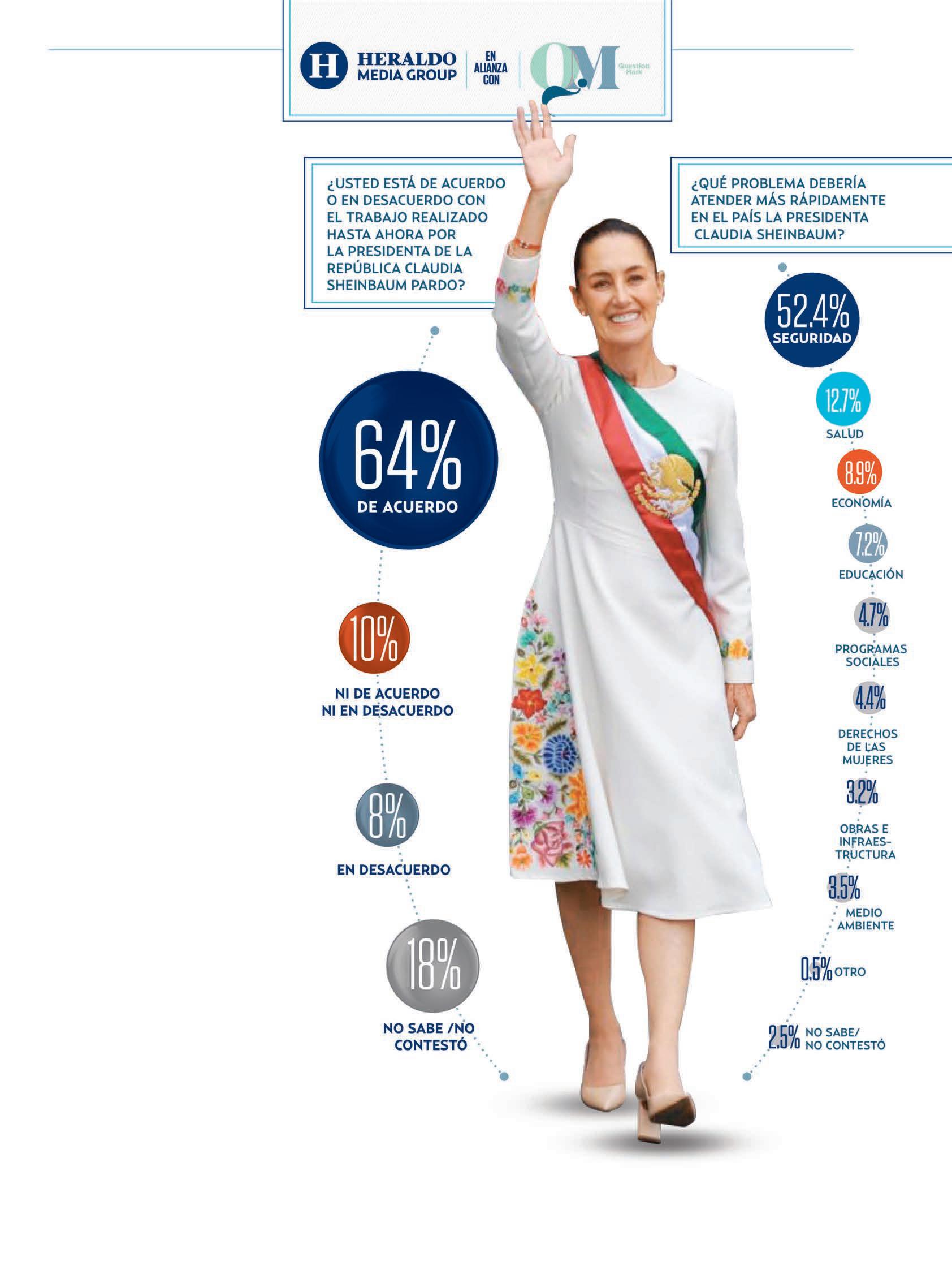 De acuerdo con la encuesta realizada por QM Estudios de Opinión, en alianza con Heraldo Media Group, y a la pregunta de: ¿Usted está de acuerdo o en desacuerdo con el trabajo realizado hasta ahora por la Presidenta de la República, Claudia Sheinbaum Pardo?”, 64 por ciento respondió “de acuerdo”; mientras que 10 por ciento “ni de acuerdo, ni en desacuerdo”; 8 por ciento, “en desacuerdo” y 18 por ciento “no sabe o no contestó”.