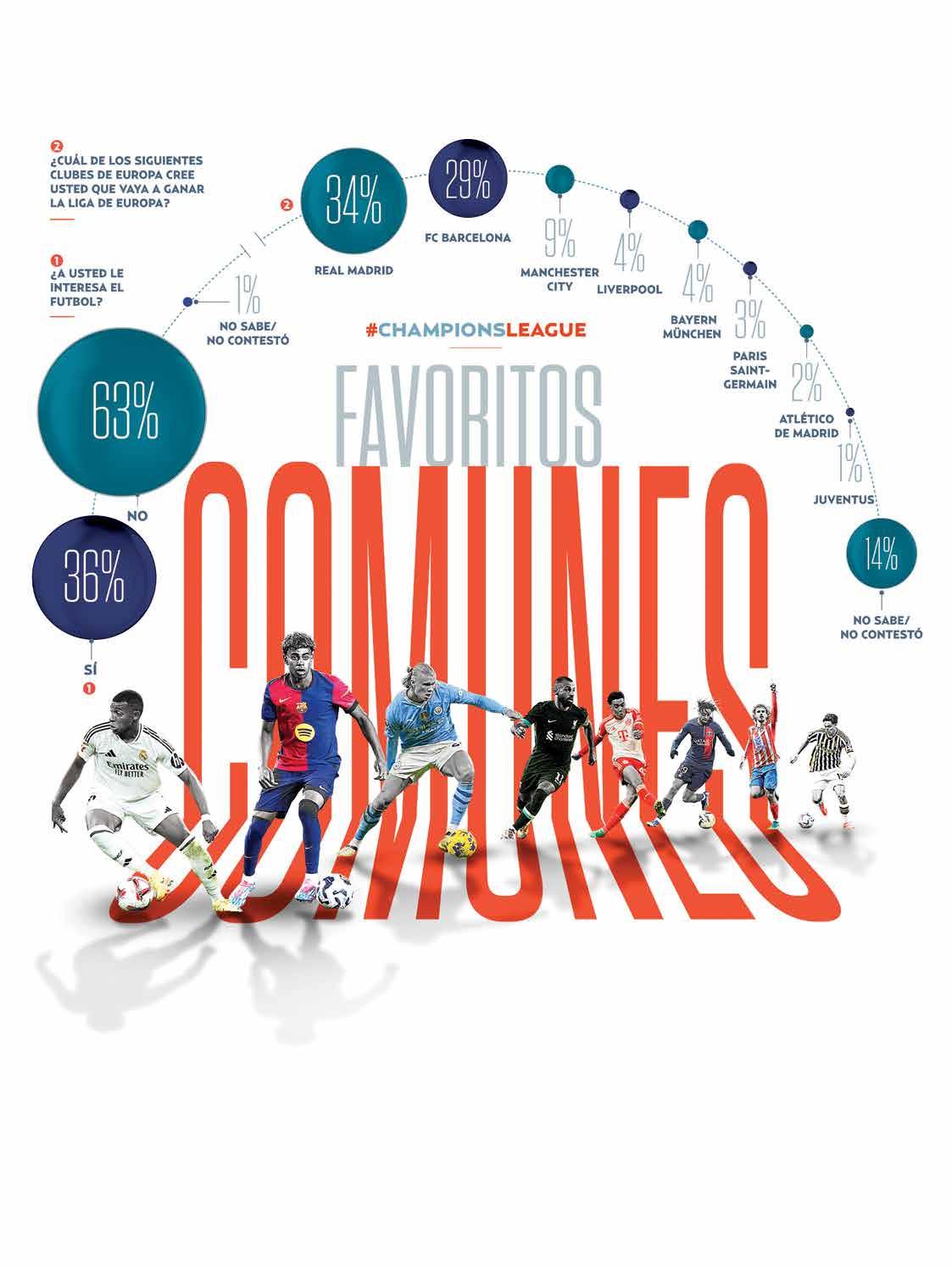 otros candidatos, aunque en menor medida: PSG (tres por ciento), Atlético de Madrid (dos por ciento) y Juventus (uno por ciento). Asimismo, destaca que 14 por ciento de los cuestionados no supo contestar con precisión Por otro lado, 36 por ciento manifestó que sí les interesa el