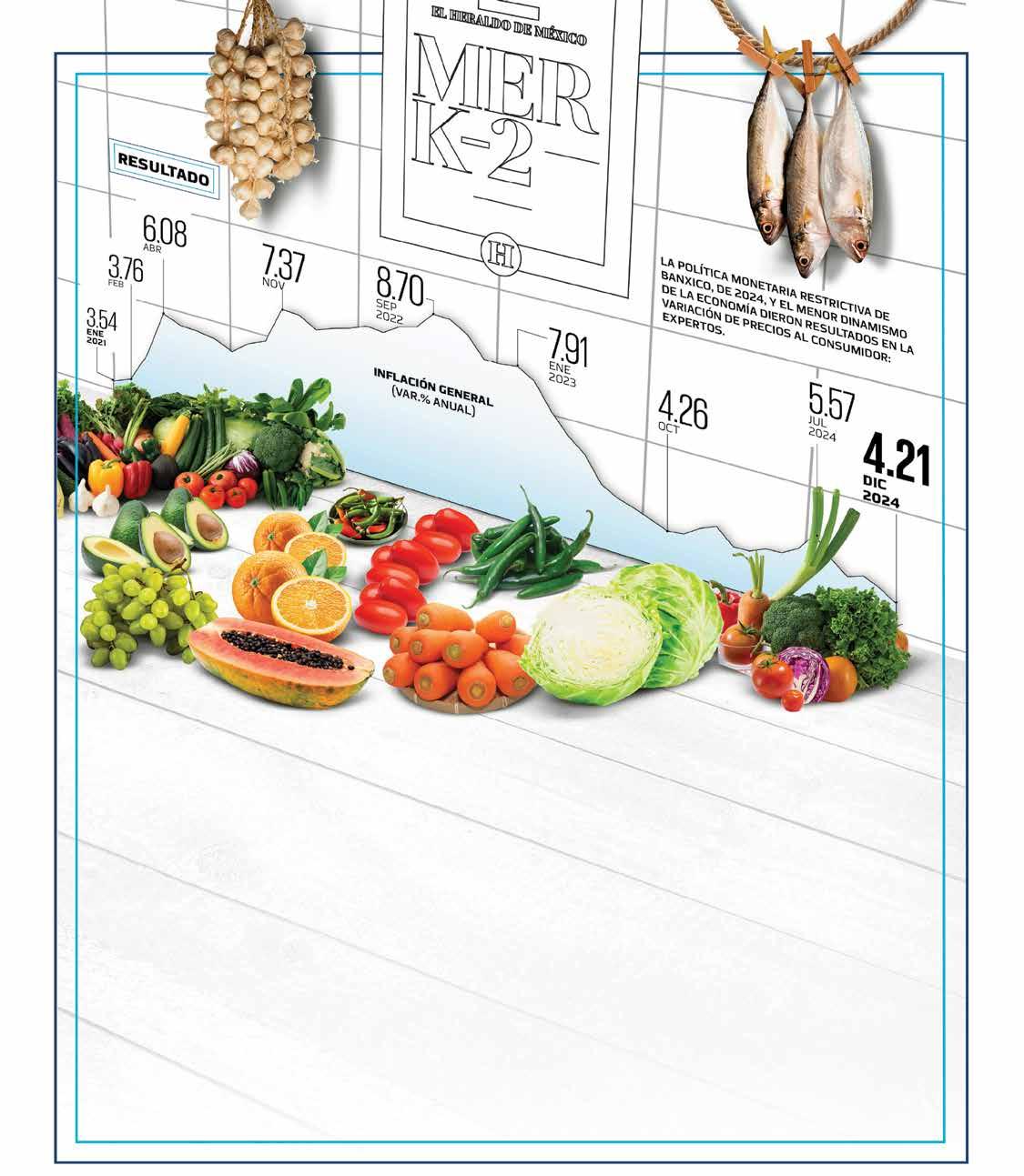La inflación general anual concluyó diciembre de 2024 en 4.21 por ciento, su nivel más bajo desde febrero de 2021, según el Instituto Nacional de Estadística y Geografía (Inegi). La menor inflación se debió en parte a la desaceleración económica en México y con ello se eleva la probabilidad de que la Junta de Gobierno del Banco de México haga un recorte de la tasa de interés de 50 puntos base en su anuncio de política monetaria del 6 de febrero, consideró Gabriela Siller, directora de Análisis Económico Financiero de Grupo Financiero Base. En tanto que, Ricardo Aguilar Abe, economista en jefe de Invex, refirió que a pesar de que 2024 finalizó con una trayectoria inflacionaria descendente, el panorama para 2025 luce complejo ante un balance de riesgos sesgado al alza.