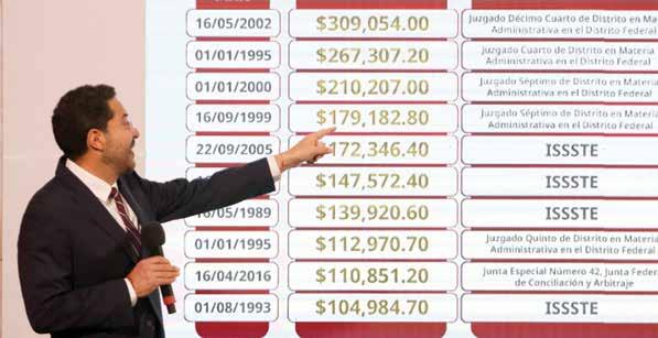 “El límite máximo que marca la ley son 10 Umas, que son como 34 mil pesos, pero si ustedes observan hay una pensión de 309 mil pesos que el ISSSTE paga desde el año 2002”, dijo al presentar una tabla con algunos casos que han detectado.