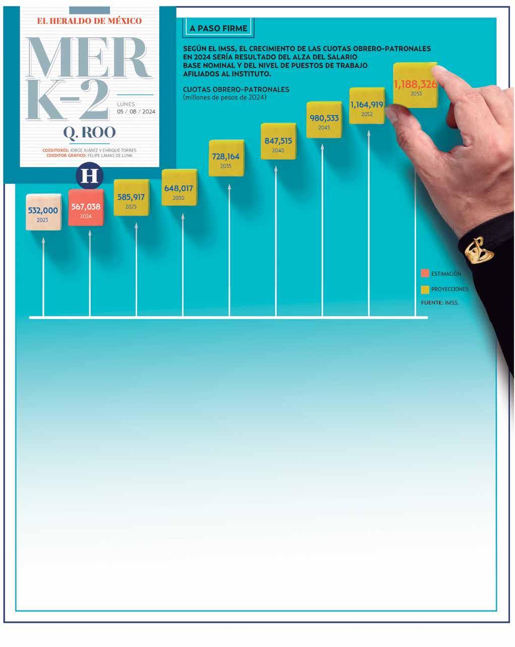 De 2019 al cierre de 2023, la recaudación del Instituto Mexicano del Seguro Social (IMSS) pasó de 320 mil millones de pesos a 532 mil millones de pesos, lo que significó un incremento de 66.25 por ciento.
