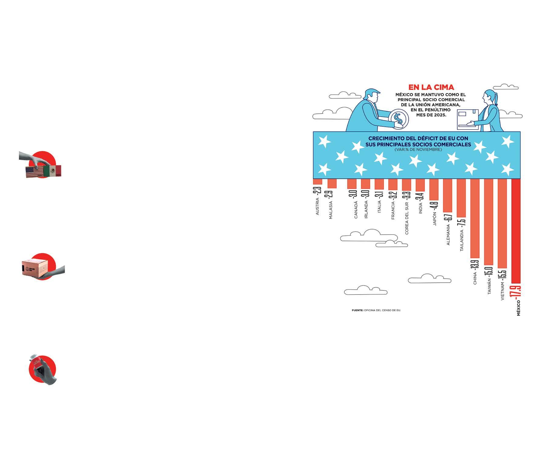 Hacia adelante y de cara a la revisión del T-MEC, considero que México seguirá consolidándose como el principal socio comercial de Estados Unidos, pese a la retórica agresiva de Trump hacia el país. Por su parte, el Consejo Coordinador Empresarial (CCE) señaló, en un comunicado, que entre los sectores clave que impulsan la integración del país con EU destacan maquinaria y equipo, vehículos y autopartes, productos electrónicos, los dispositivos médicos, el acero, la energía y los granos. En conjunto, estos sectores sustentan la competitividad global de América del Norte, aseguró.