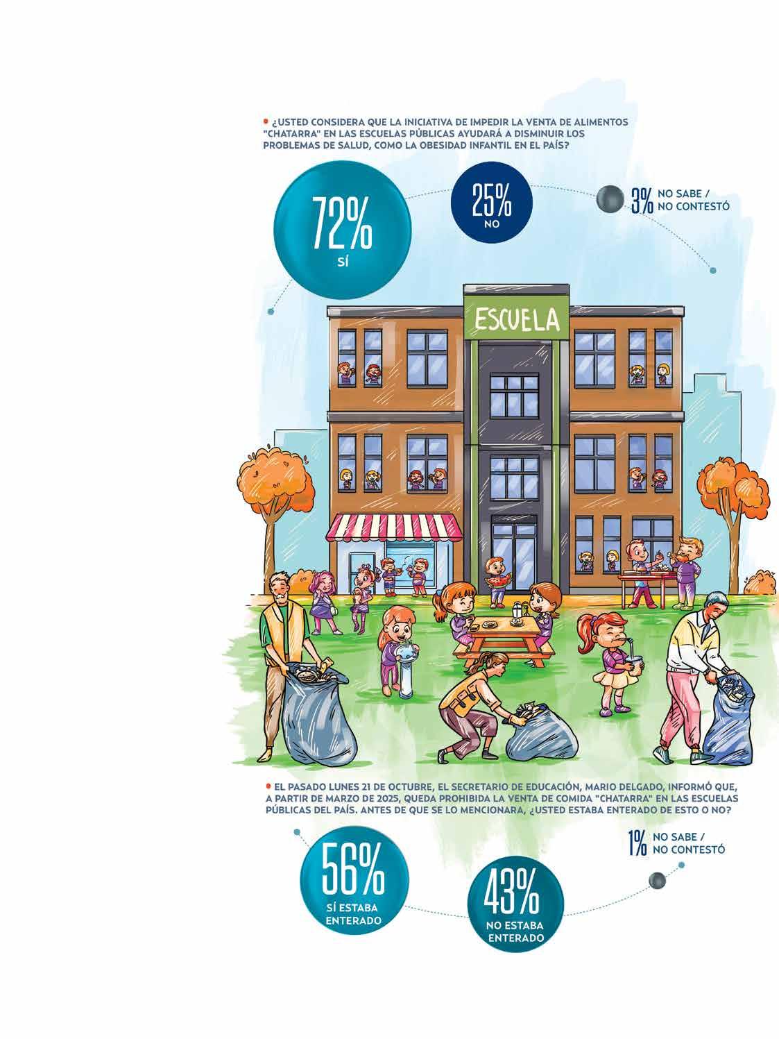 “¿Usted considera que la iniciativa de impedir la venta de alimentos chatarra en las escuelas públicas ayudará a disminuir los problemas de salud, como la obesidad infantil en el país?, 72 por ciento respondió que “sí”; 25 por ciento dijo que “no” y 3 por ciento “no sabe/no contestó”.