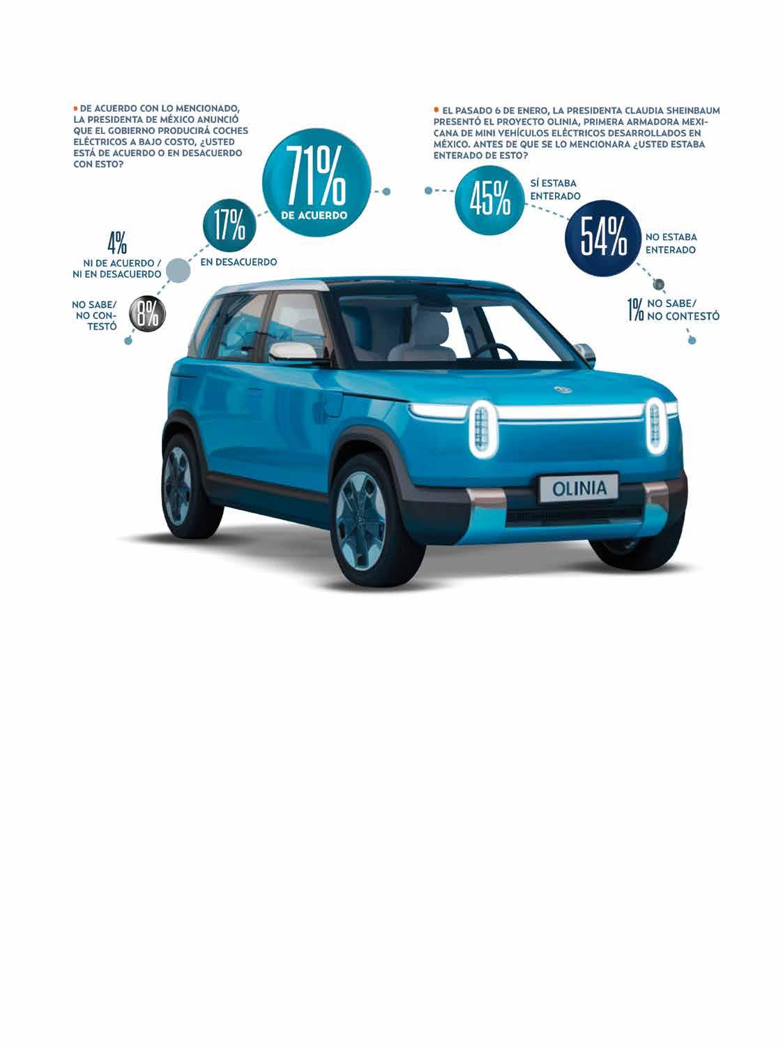 A inicios de año, la presidenta Claudia Sheinbaum presentó la armadora Olinia, que es la primera marca de autos eléctricos mexicanos que busca manufacturar y venderlos a bajo precio, y que los mismos no dañen el medio ambiente. Así, casi la totalidad de la ciudadanía consultada en la encuesta de QM Estudios de Opinión, en alianza con Heraldo Media Group, está a favor del proyecto automotriz