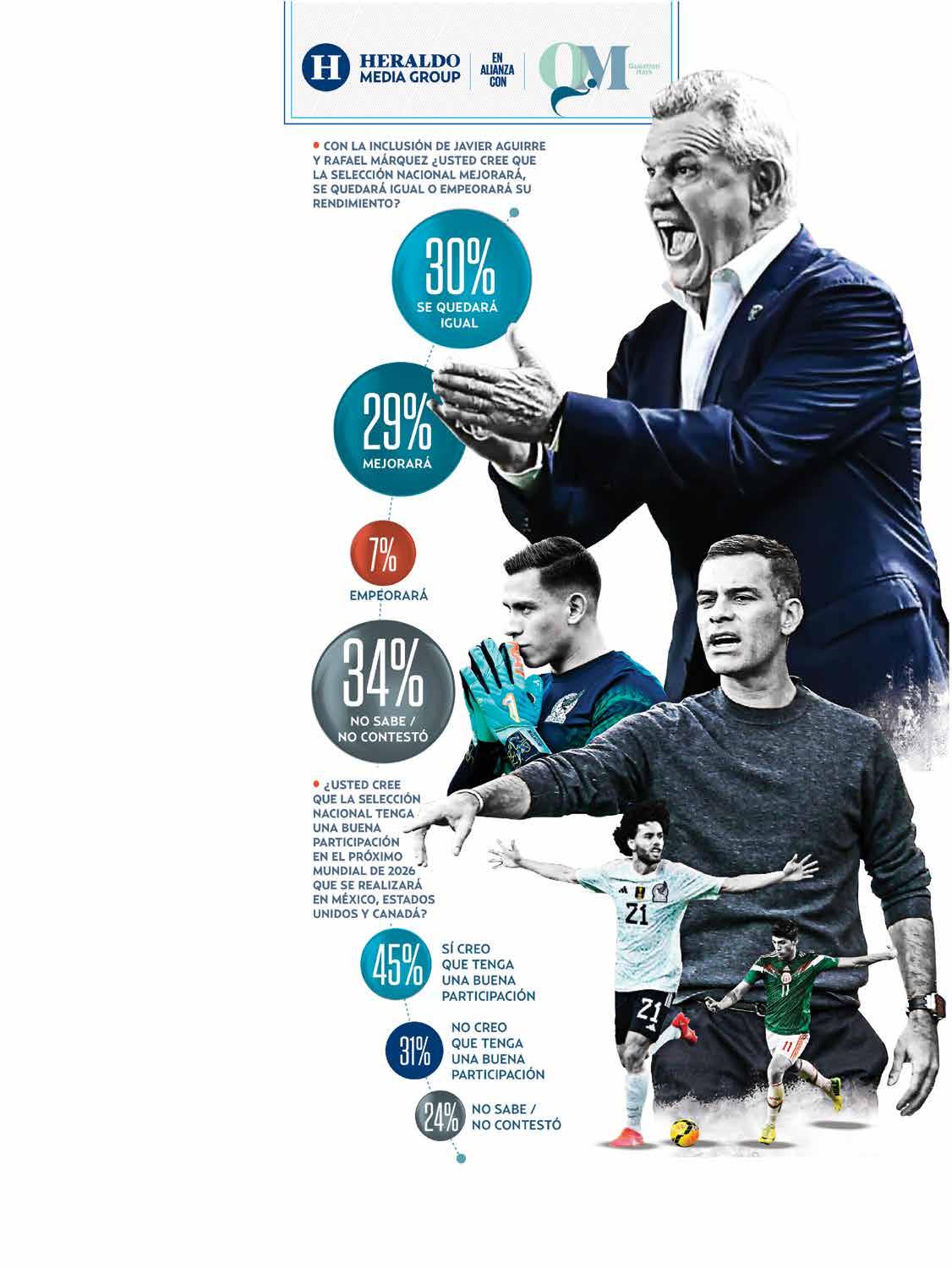 La Selección Mexicana vive una nueva etapa con Javier Aguirre y Rafael Márquez en el banquillo, cuya llegada da esperanza a los aficionados de cara al próximo Mundial de 2026 que organizan México, Estados Unidos y Canadá. De acuerdo con la encuesta realizada por QM Estudios de Opinión, en alianza con Heraldo Media Group, 45 por ciento de los aficionados sí ven una destacada participación del Tricolor durante el torneo de balompié más importante del orbe; 31 por ciento descartó dicha posibilidad.