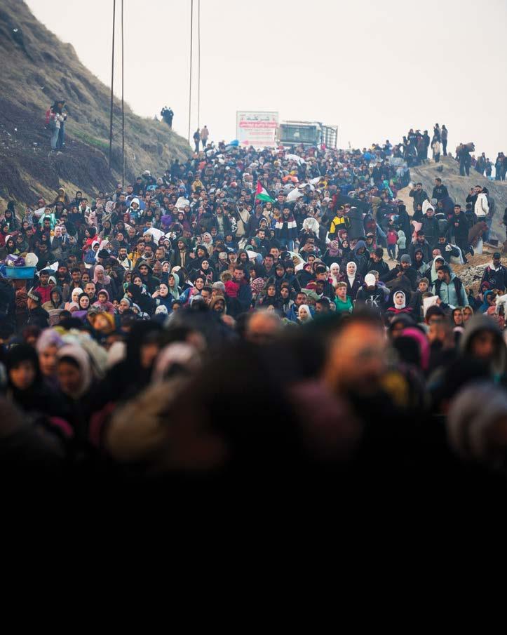 norte del territorio, en el marco del frágil alto el fuego alcanzado por Israel y el movimiento islamista, tras más de 15 meses de guerra. El acuerdo, vigente desde el 19 de enero, abre la puerta a un nuevo canje de rehenes por presos palestinos. Una enorme multitud de refugiados palestinos que caminaban cargados con sus pertenencias, algunos sosteniendo bebés o empujando sillas de ruedas, se extendía por una larga autopista paralela a la costa, en un impactante retorno del éxodo masivo desde el norte que se vio al inicio de la guerra, y que muchos palestinos temían Israel mantuviera de forma permanente.